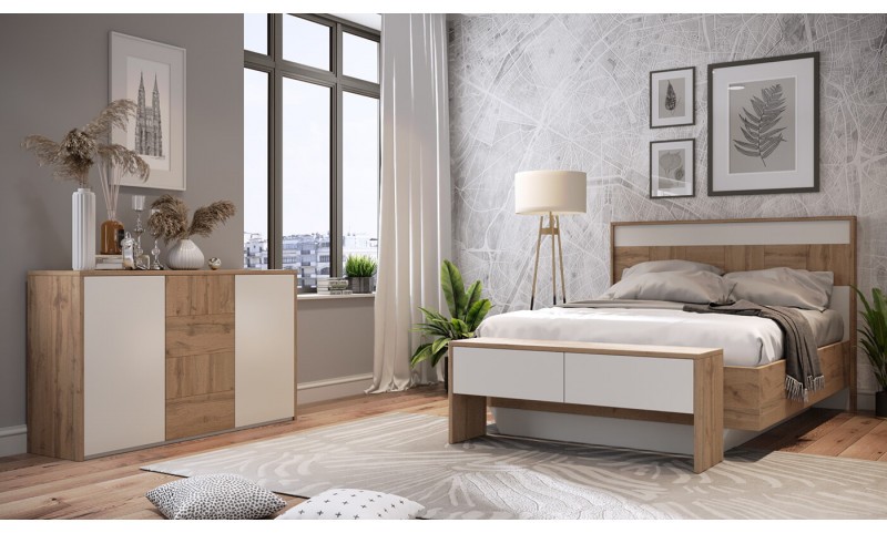Функциональность модульной спальни Аризона обеспечивает наличие комода с 4 выдвижными ящиками и двумя боковыми отделами, прикроватной банкетки и просторной двуспальной кровати. Для производства деталей комплекта использована ЛДСП высокого качества. Она обеспечивает мебели надежность, длительный срок службы, стойкость к внешним воздействиям и абсолютную безопасность.