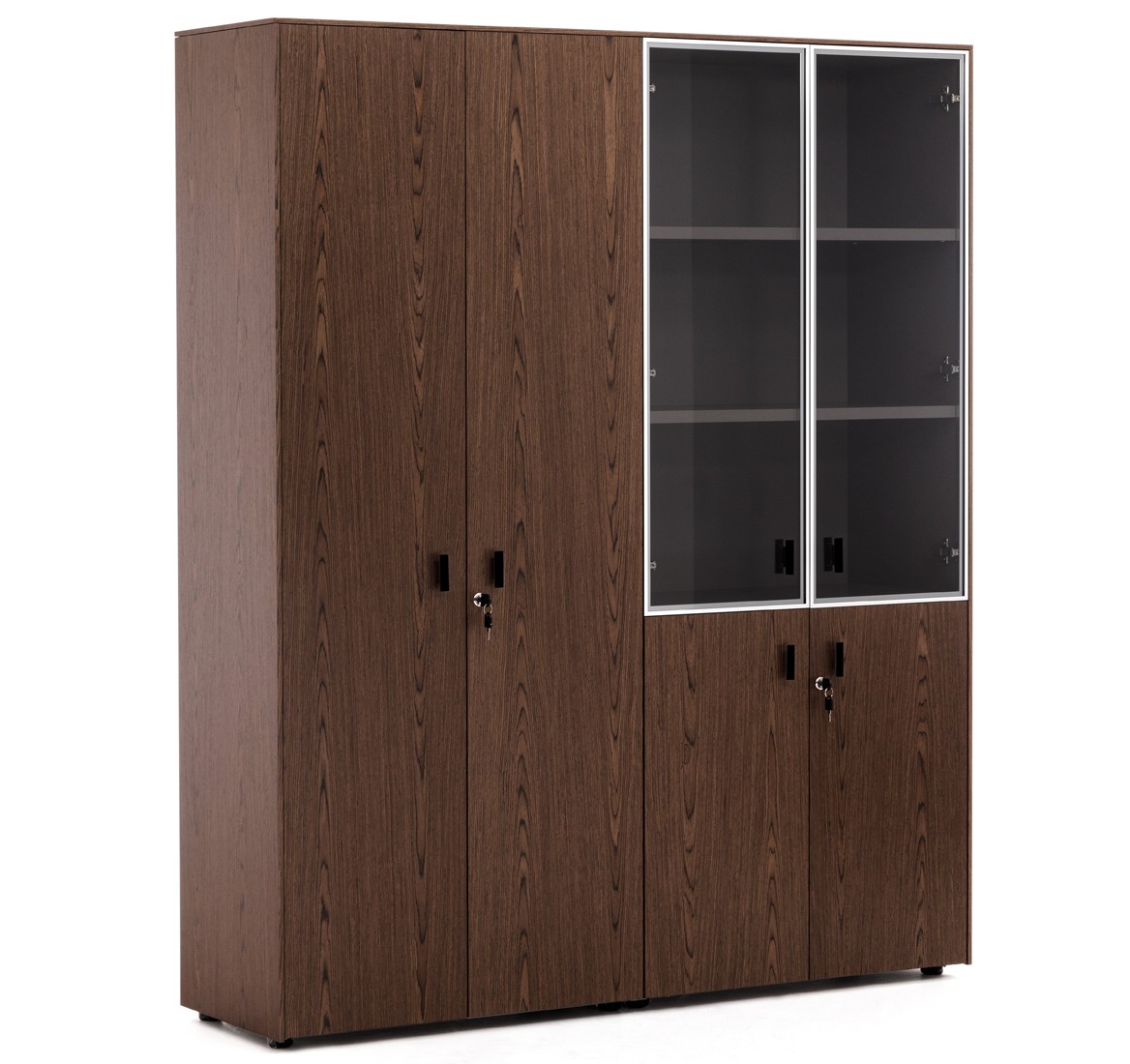 Фасады дверей укомплектованы ручками под цвет металлических опор письменных столов — хромированные или черные (порошковая покраска).