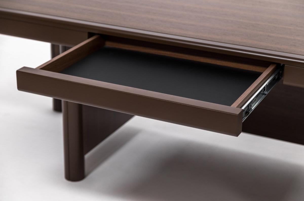 В столешнице письменного стола имеется выдвижной пенал на роликовых направляющих с плавным закрыванием. Внутренние размеры пенала 65х45 см. Дно пенала обтянуто натуральной кожей черного цвета.