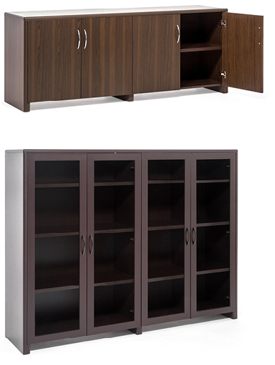 Две верхние стеклянные двери шкафа для бумаг обрамлены в раму из крашенного МДФ толщиной 25 мм. Стекло толщиной 4 мм закаленное тонированное в массе серое. Глухие нижние двери — МДФ толщиной 25 мм + шпон. Как стеклянные, так и деревянные двери укомплектованы петлями с механизмом плавного закрывания. Внутри шкафа 5 книжных полок.