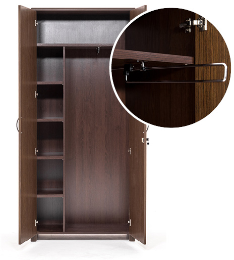 Гардероб и шкаф для бумаг имеют размер 94х45х211 см. Внутри гардероба верхняя полка во всю ширину шкафа. Высота верхней секции 29,7 см. Вертикальная перегородка делит гардероб на две части: 26,3 см отведено под полки, 60 см под гардеробную часть. Гардеробная часть оснащена выдвижной штангой. Левая дверь закрывается изнутри на шпингалет, после чего замок на правой дверце шкафа запирает обе двери.