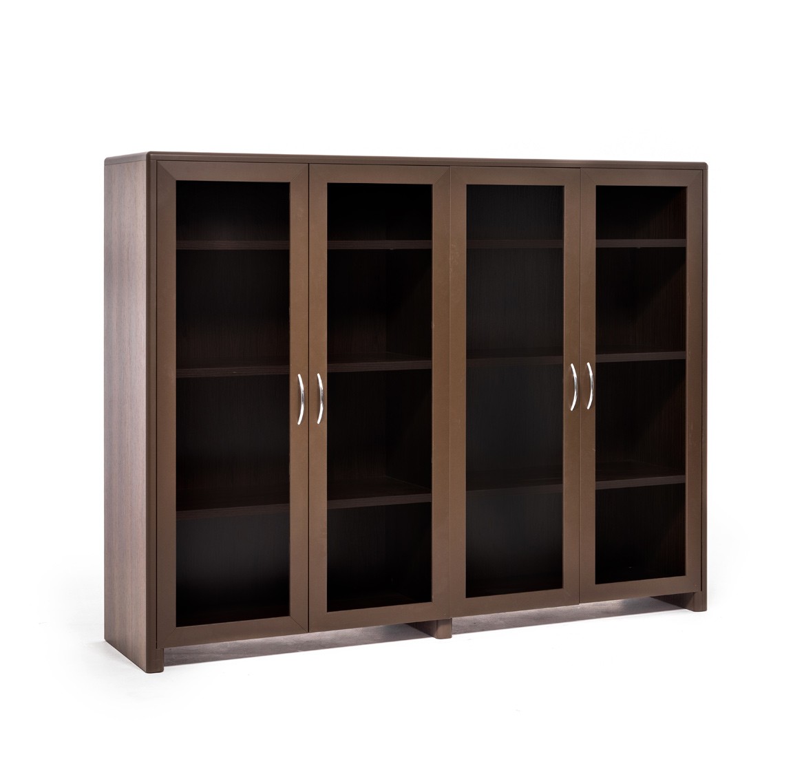 Две верхние стеклянные двери шкафа для бумаг обрамлены в раму из крашенного МДФ толщиной 25 мм. Стекло толщиной 4 мм закаленное тонированное в массе серое. Глухие нижние двери — МДФ толщиной 25 мм + шпон. Как стеклянные, так и деревянные двери укомплектованы петлями с механизмом плавного закрывания. Внутри шкафа 5 книжных полок.