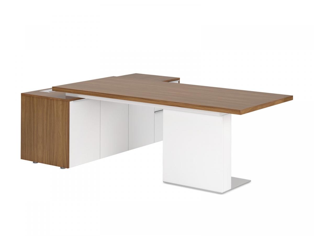 ССтолы руководителя: Столешница толщиной 38 мм опирается на белую опору с металлической пластиной в основании. Внутренний коммуникационный блок с 3 розетками 220 В,