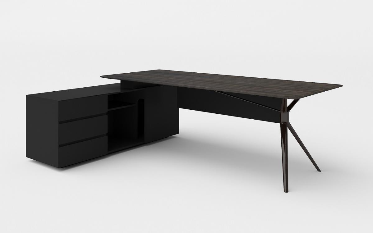 Столешница толщиной 26 мм имеет оригинальный скруглённый край, выполнена из шпона. Литые алюминиевые опоры с гальваническим покрытием. Опоры могут быть в стильном "черном" хроме, либо стандартном блестящем хроме. Боковая тумба с 3 ящиками и 1 откатной дверкой. Без замков. Тумба служит одной из опор стола.