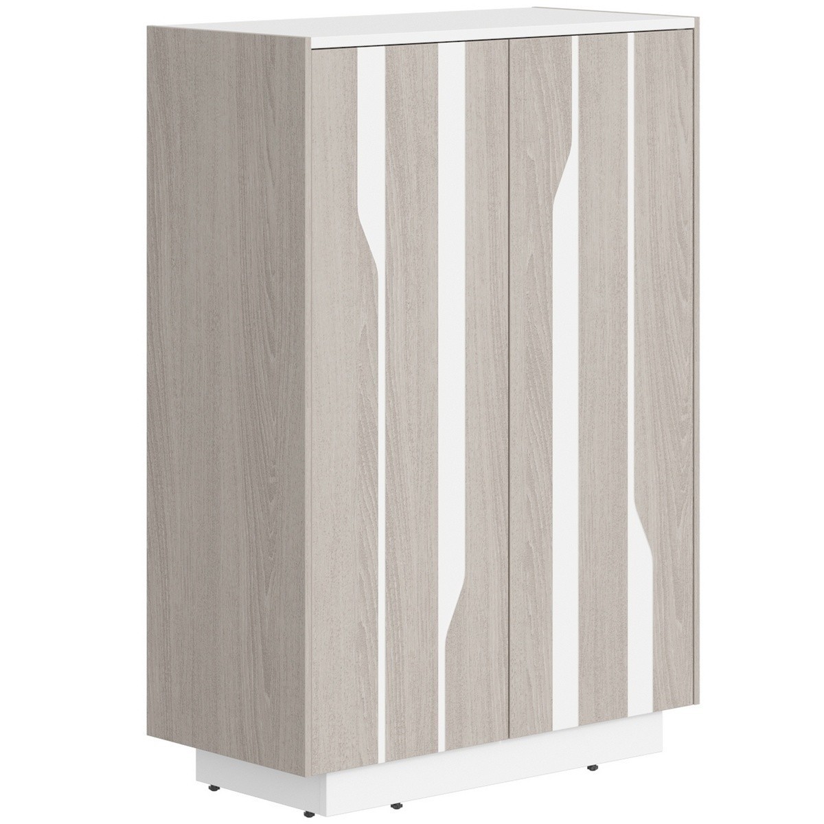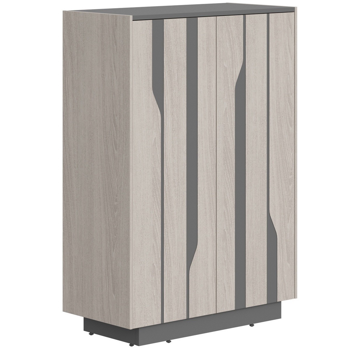 Каркас из ЛДСП т.18мм, кромка ABS т.0,8мм, задняя стенка из ЛДСП т.18мм. Наружная декоративная обкладка из МДФ т.12мм, покрытие - шпон. Фасады - из МДФ т.19мм, покрытие - шпон, с декоративным фигурным рисунком. Открывание фасадов - система "Push to Open". Каркас шкафа устанавливается на цокольной коробке. Регулируемые опоры, диапазон регулировок - от 0 до 12мм.