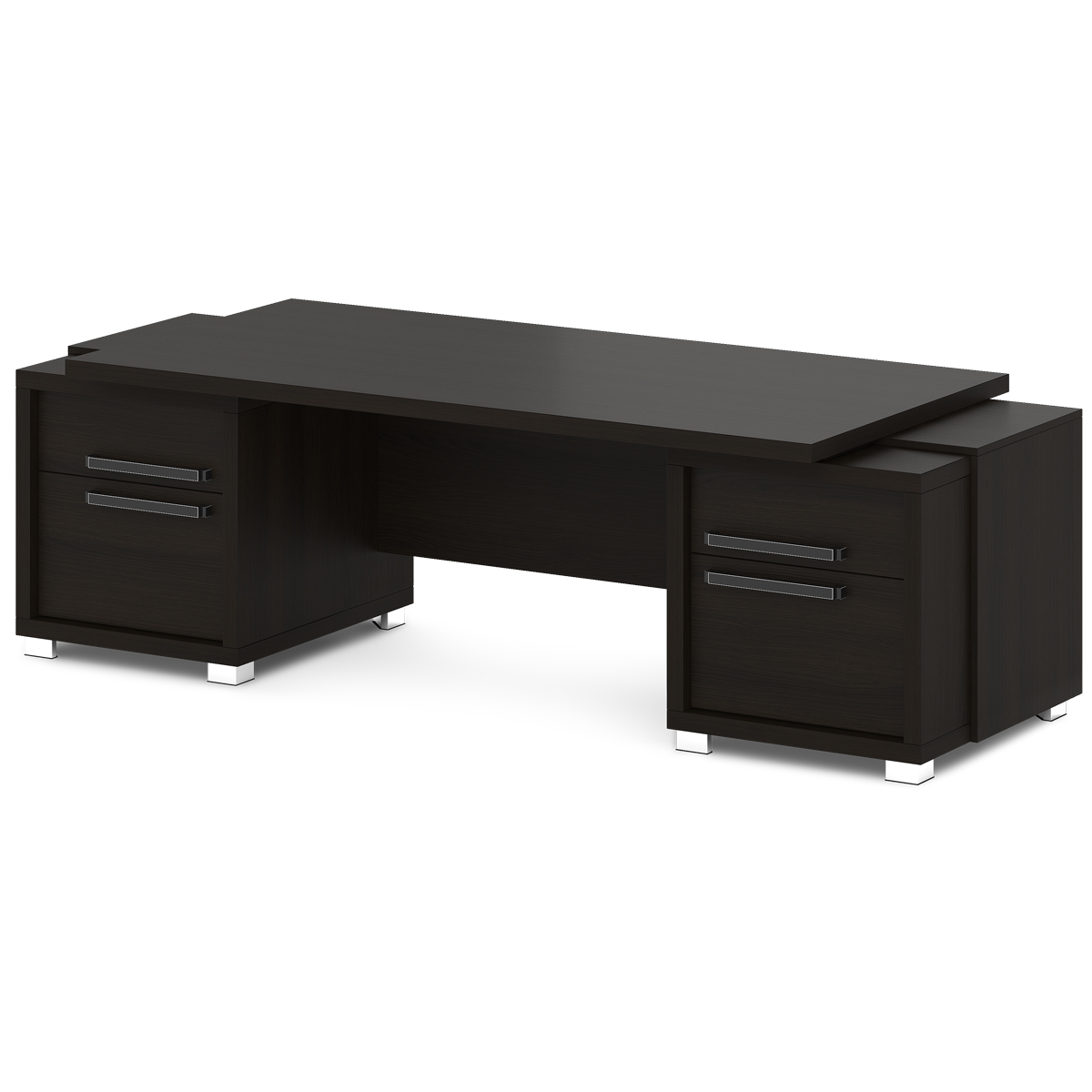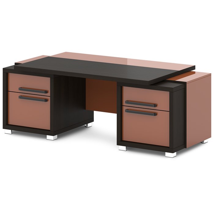 Стол руководителя с двумя тумбами. Тумбы имеют по 3 ящика (2 внешних и 1 внутренний) на шариковых направляющих скрытого монтажа полного выдвижения, обладающих плавным ходом и оборудованных доводчиками.