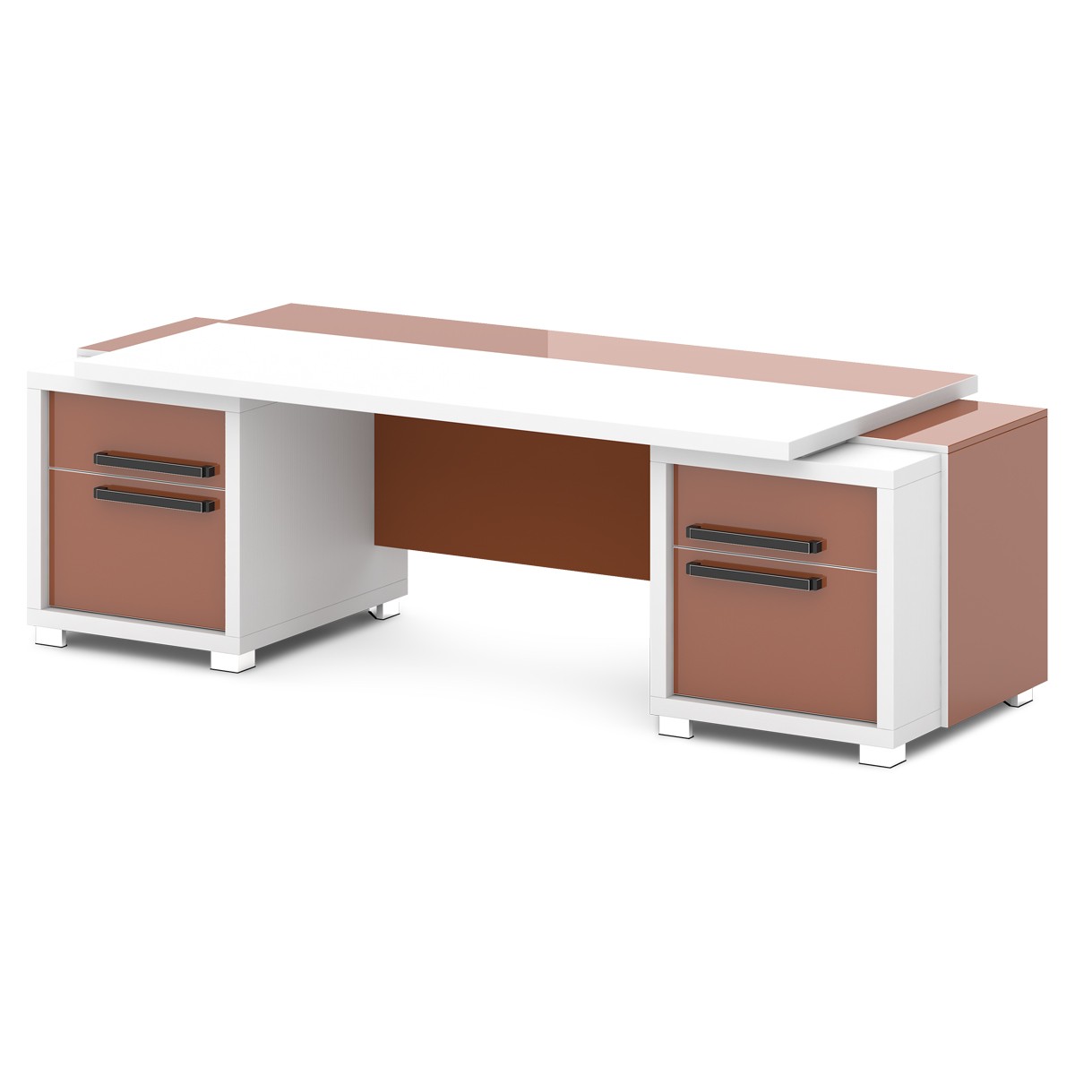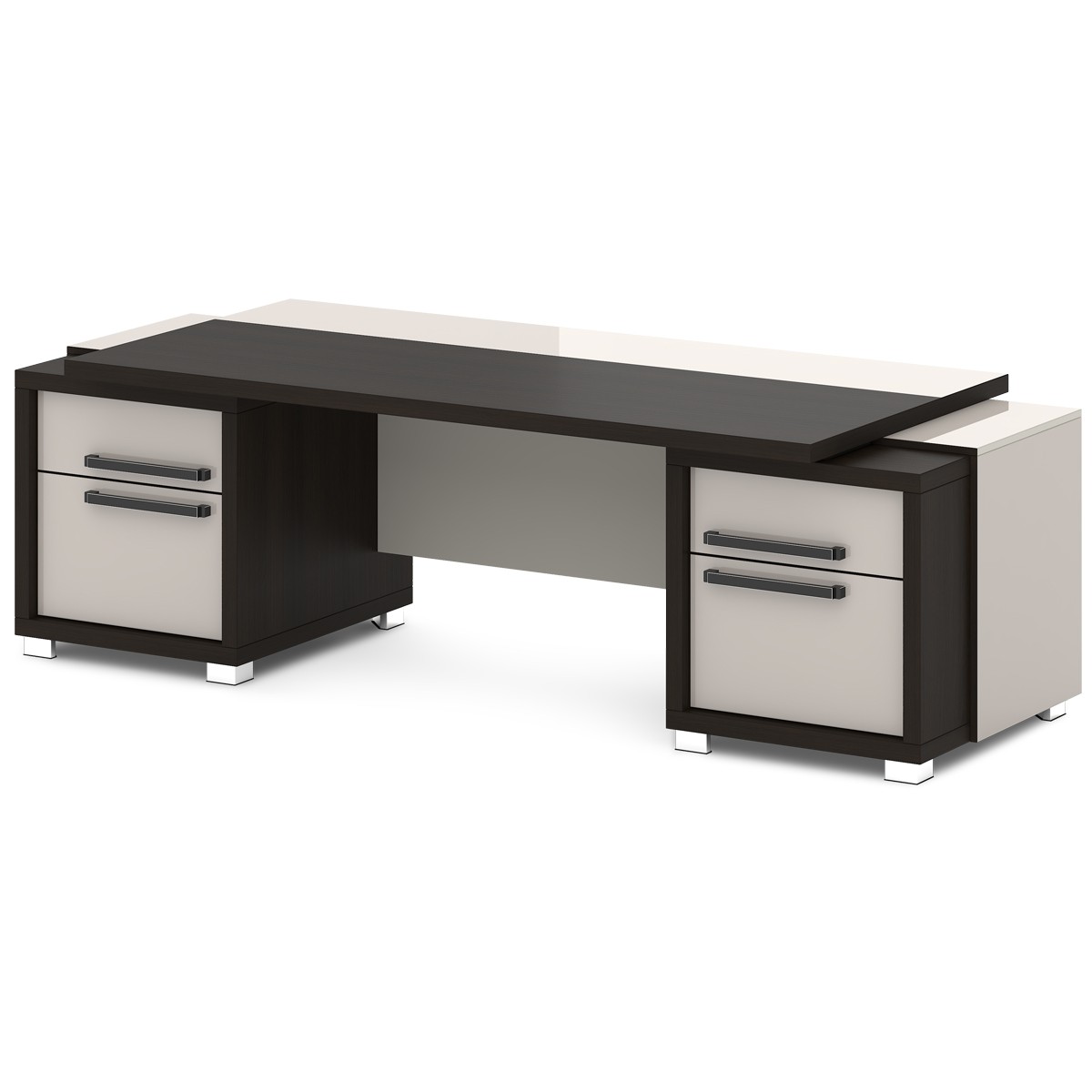 Стол руководителя с двумя тумбами. Тумбы имеют по 3 ящика (2 внешних и 1 внутренний) на шариковых направляющих скрытого монтажа полного выдвижения, обладающих плавным ходом и оборудованных доводчиками.