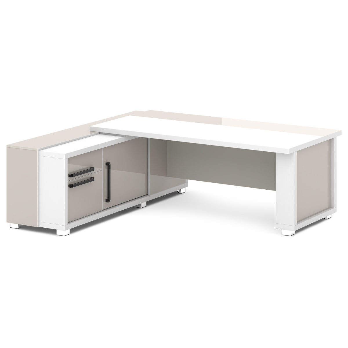 Стол руководителя с двумя тумбами. Тумбы имеют по 3 ящика (2 внешних и 1 внутренний) на шариковых направляющих скрытого монтажа полного выдвижения, обладающих плавным ходом и оборудованных доводчиками.