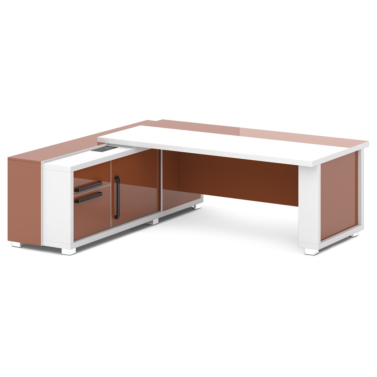 Стол руководителя с тумбой и греденцией. Размер столешницы 2000х1000 мм. Состоит из двух тумб (тумба малая и тумба-греденция), служащих опорами, столешницы и соединительного щита. Стол левый – тумба-греденция с левой стороны, малая тумба – с правой стороны. Стол правый – тумба-греденция с правой стороны, малая тумба – с левой стороны. На рис. - левый.