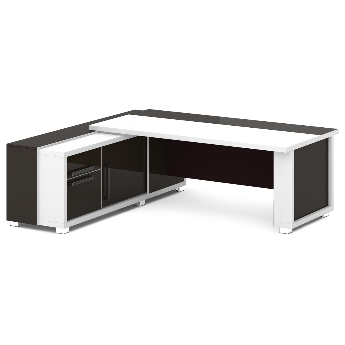 Стол руководителя с двумя тумбами. Тумбы имеют по 3 ящика (2 внешних и 1 внутренний) на шариковых направляющих скрытого монтажа полного выдвижения, обладающих плавным ходом и оборудованных доводчиками.