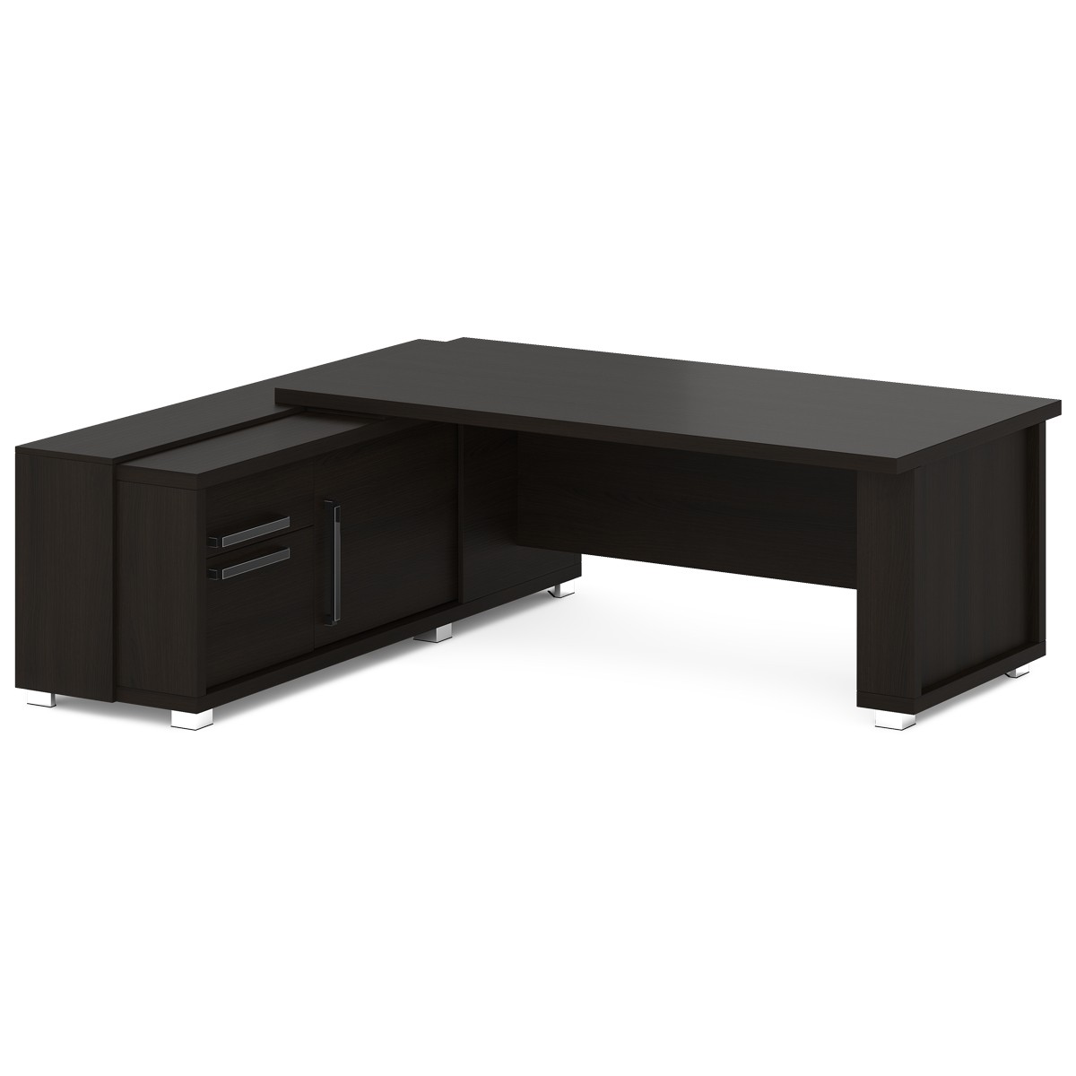 Стол руководителя с двумя тумбами. Тумбы имеют по 3 ящика (2 внешних и 1 внутренний) на шариковых направляющих скрытого монтажа полного выдвижения, обладающих плавным ходом и оборудованных доводчиками.