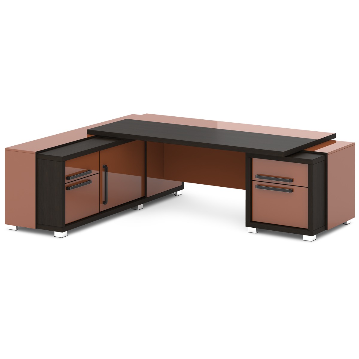 Стол руководителя с тумбой и греденцией (L-113 пр/л) Grace, Дуб Линдберг Темный и Серый Шелк 2070х2016х750 (1600х1000 - столешница) Дуб Линдберг Темный и Серый Шелк