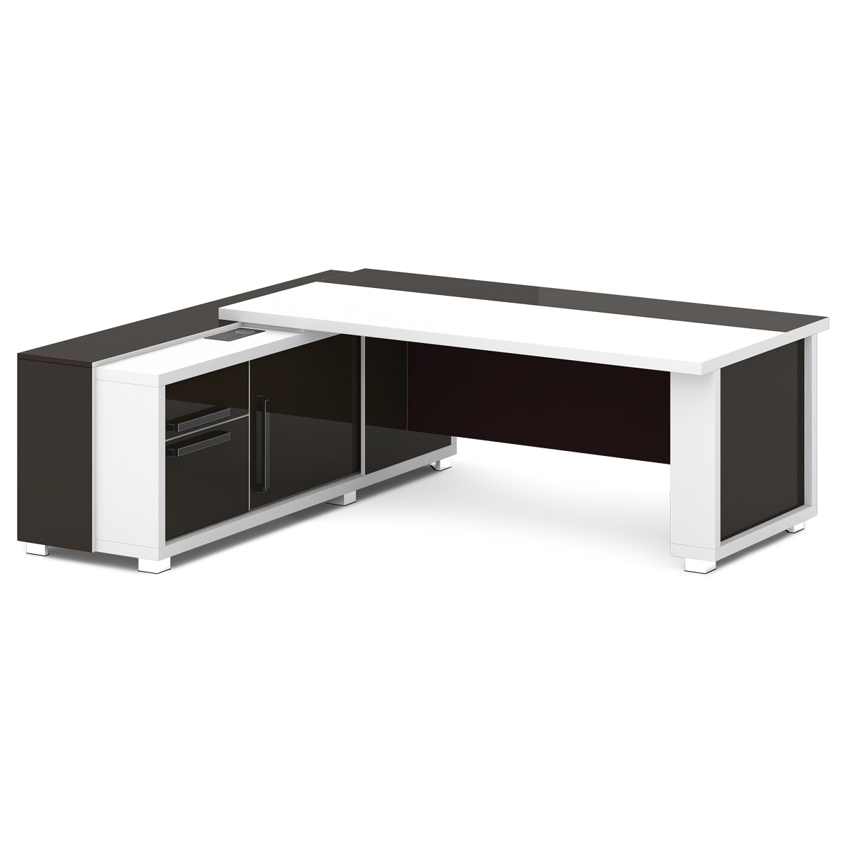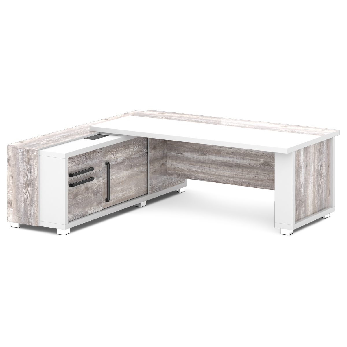Стол руководителя с тумбой и греденцией. Размер столешницы 2000х1000 мм. Состоит из двух тумб (тумба малая и тумба-греденция), служащих опорами, столешницы и соединительного щита. Стол левый – тумба-греденция с левой стороны, малая тумба – с правой стороны. Стол правый – тумба-греденция с правой стороны, малая тумба – с левой стороны. На рис. - левый.
