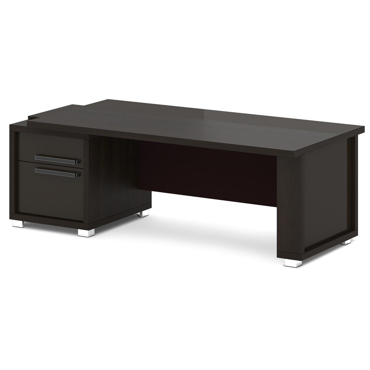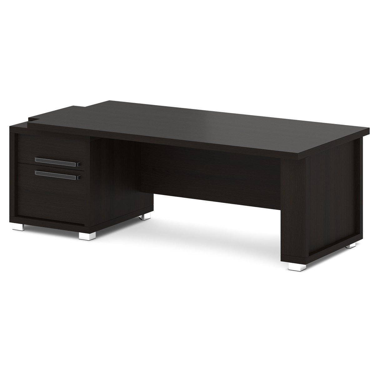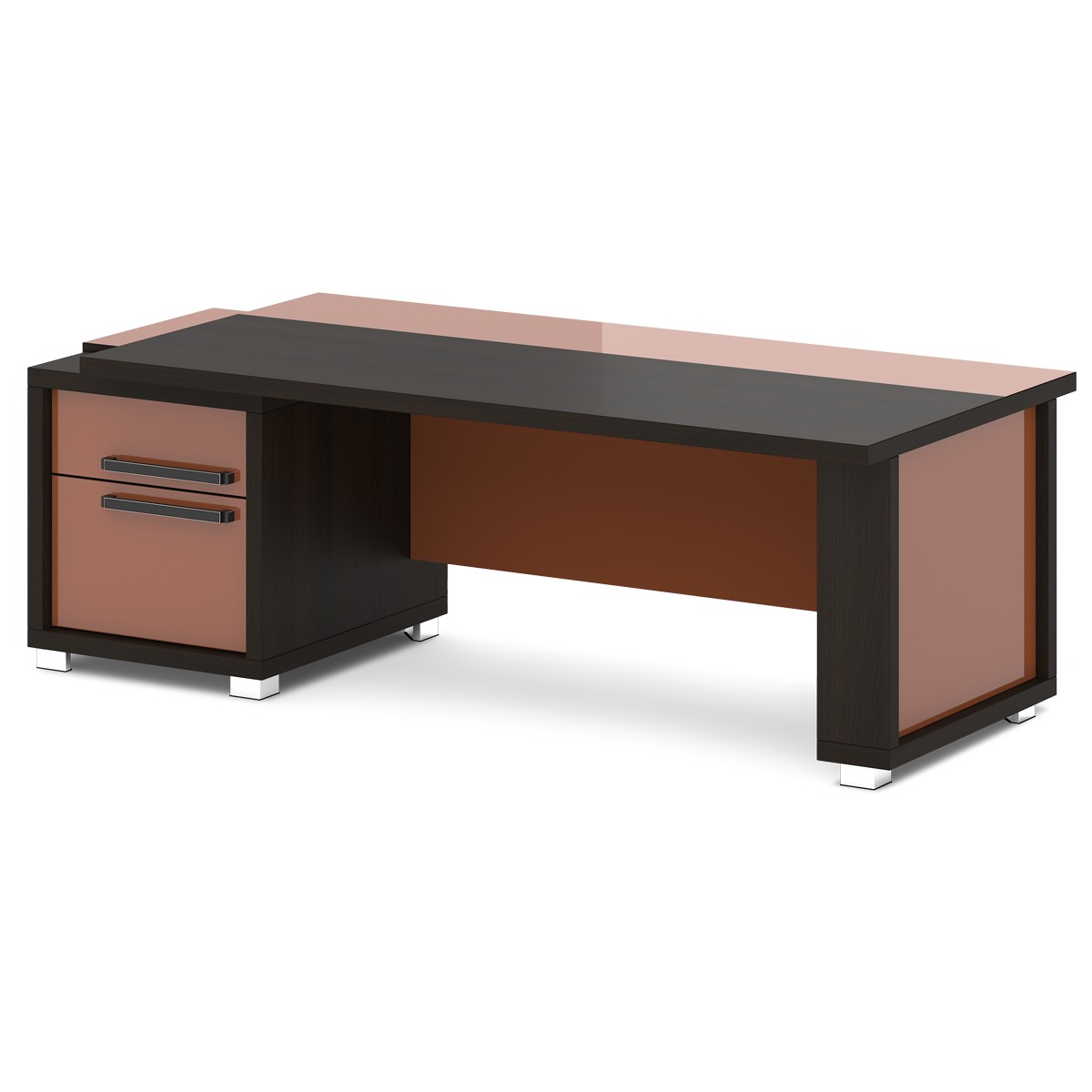 Стол руководителя с одной тумбой. Тумба имеет 3 ящика (2 внешних и 1 внутренний) на шариковых направляющих скрытого монтажа полного выдвижения, обладающих плавным ходом и оборудованных доводчиками. Стол состоит из сборной опоры и малой тумбы, служащей опорой, столешницы и соединительного щита. Стол левый – малая тумба с левой стороны, сборная опора – с правой стороны. Стол правый – малая тумба с правой стороны, сборная опора – с левой стороны. На рис. - левый.