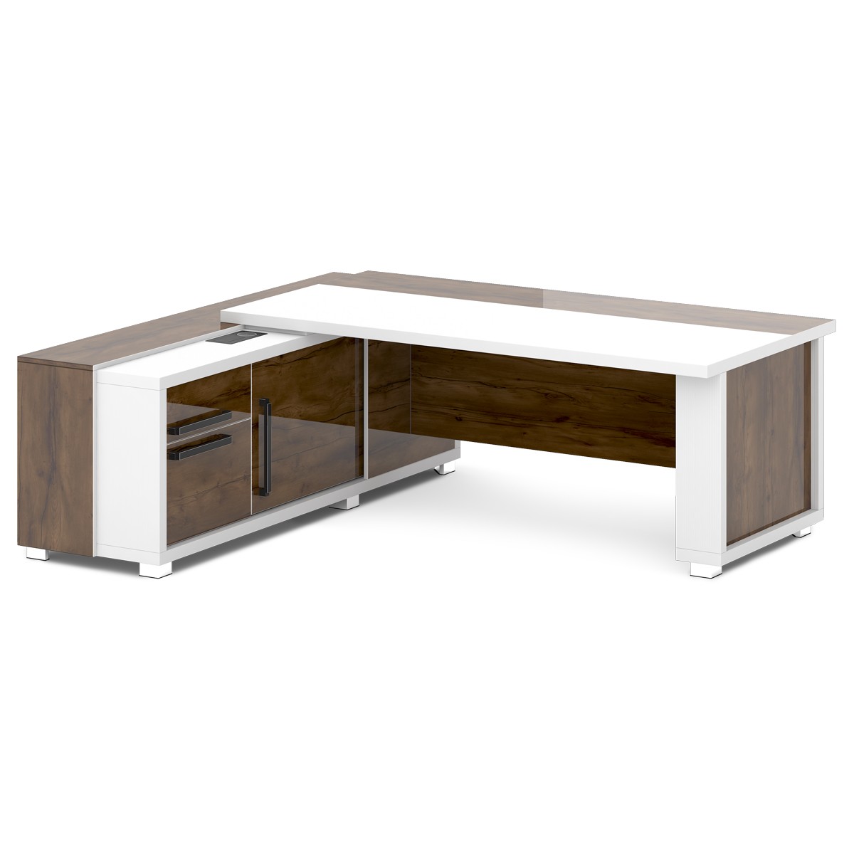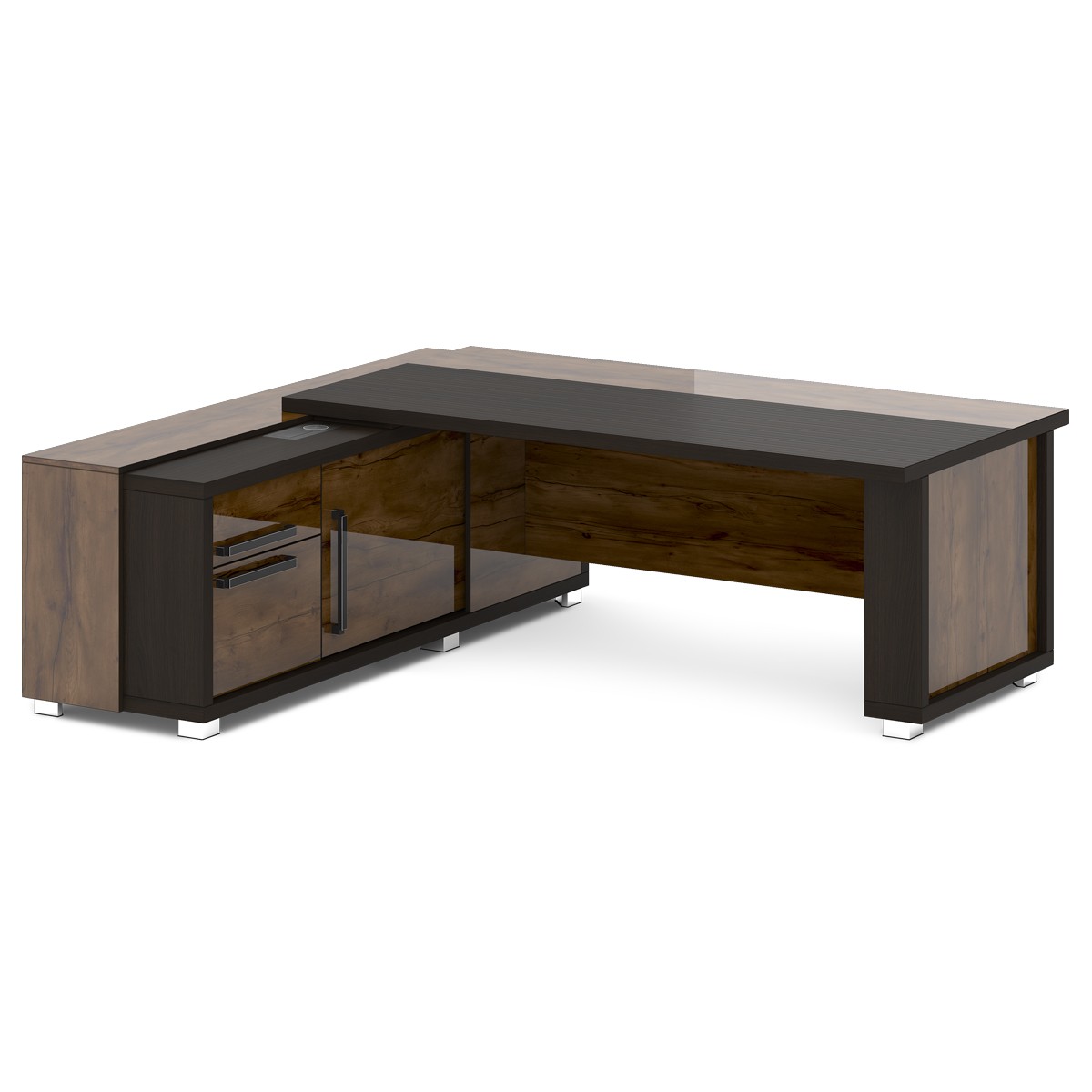Стол руководителя с тумбой и греденцией. Размер столешницы 2000х1000 мм. Состоит из двух тумб (тумба малая и тумба-греденция), служащих опорами, столешницы и соединительного щита. Стол левый – тумба-греденция с левой стороны, малая тумба – с правой стороны. Стол правый – тумба-греденция с правой стороны, малая тумба – с левой стороны. На рис. - левый.