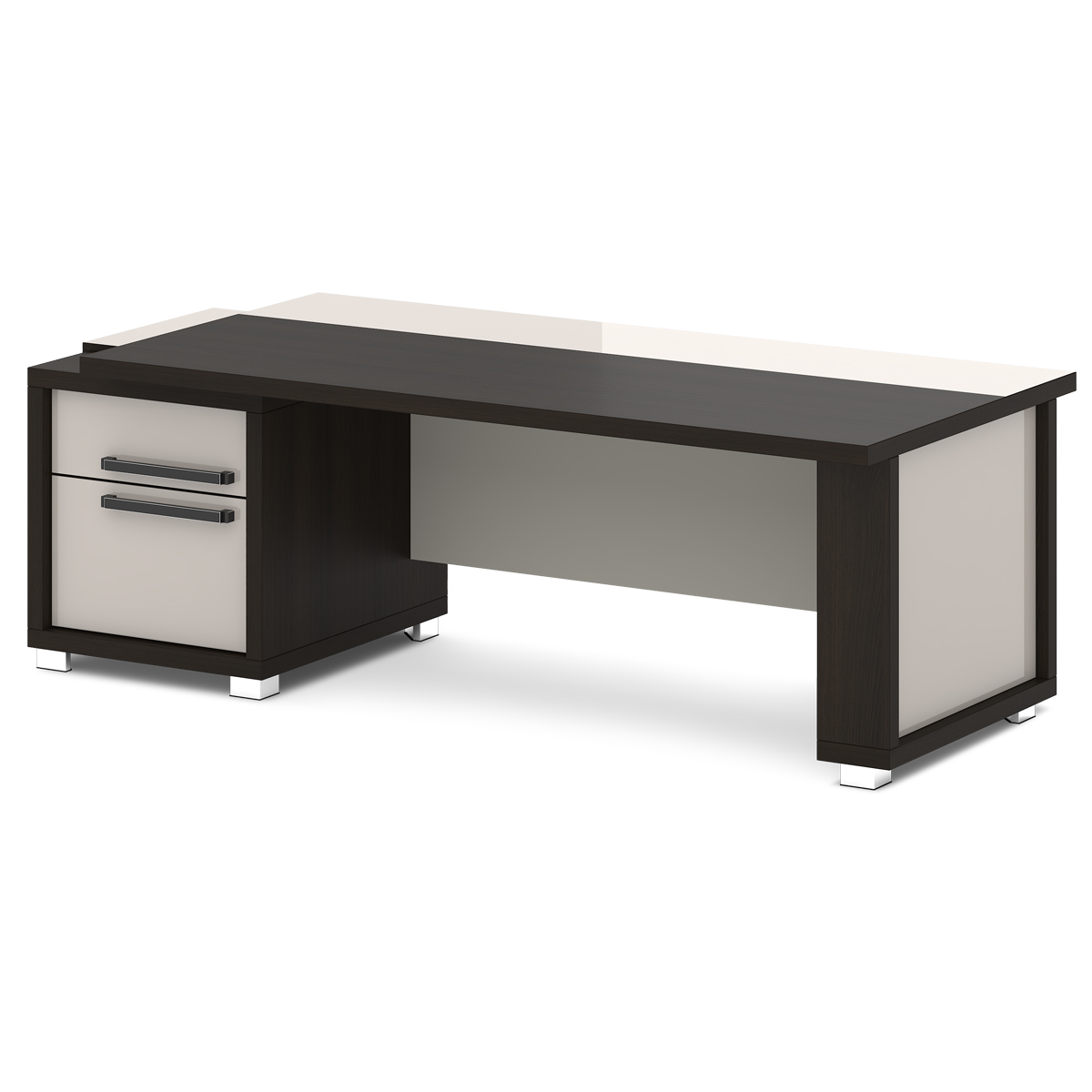 Стол руководителя с одной тумбой. Тумба имеет 3 ящика (2 внешних и 1 внутренний) на шариковых направляющих скрытого монтажа полного выдвижения, обладающих плавным ходом и оборудованных доводчиками. Стол состоит из сборной опоры и малой тумбы, служащей опорой, столешницы и соединительного щита. Стол левый – малая тумба с левой стороны, сборная опора – с правой стороны. Стол правый – малая тумба с правой стороны, сборная опора – с левой стороны. На рис. - левый.