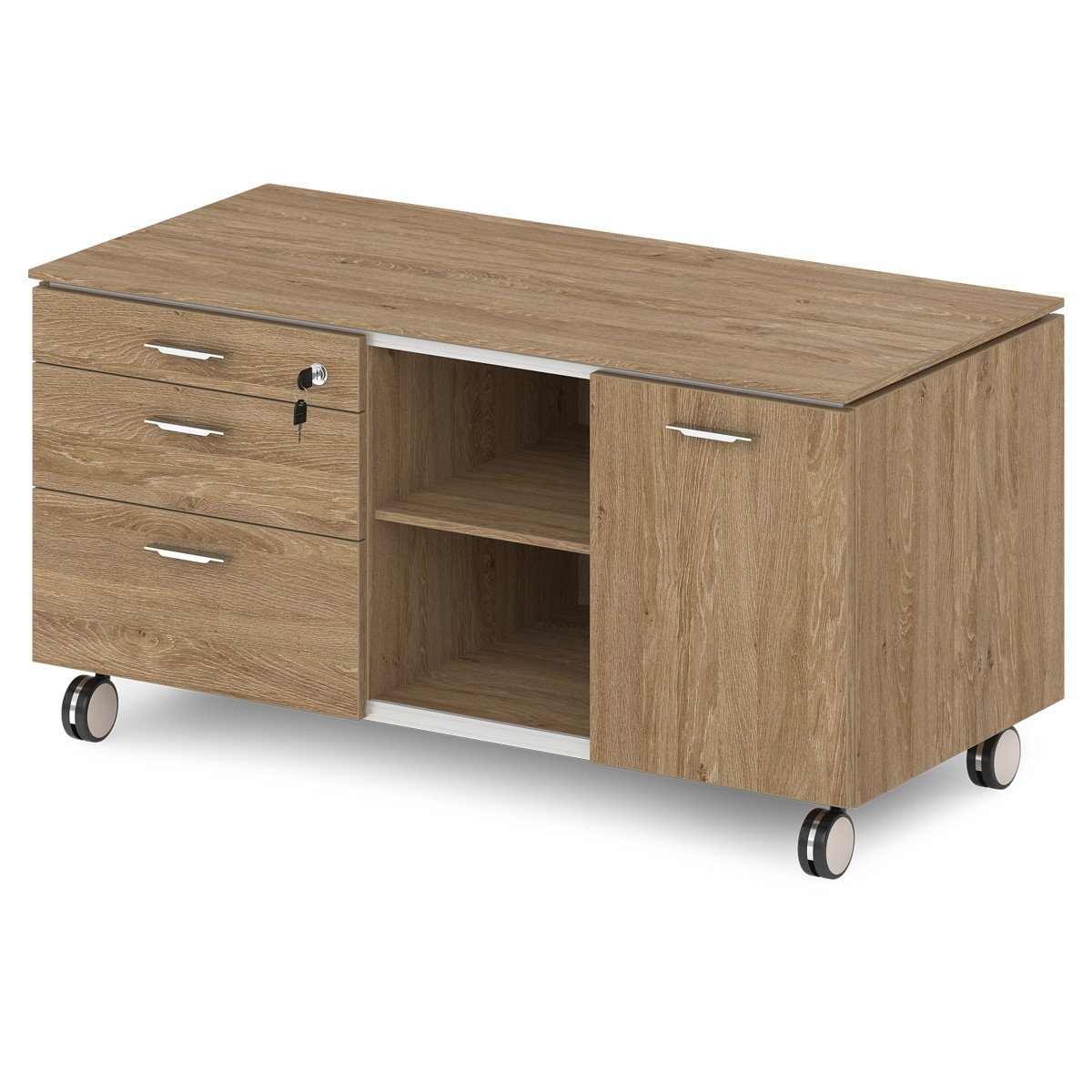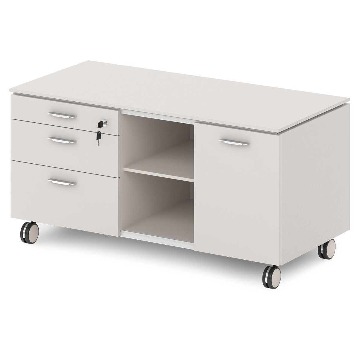 Офисная тумба подкатная "Греденция" с метабоксами, замком на 1 ящик, нишей и дверью-купе. На фото - левая тумба.