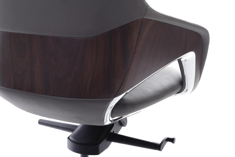 Премиальные материалы. Сочетание натуральной кожи, вставок под дерево и алюминиевых элементов создаёт благородный визуальный контраст, придавая креслу статусный вид.