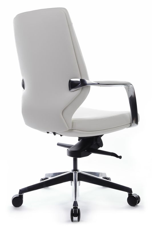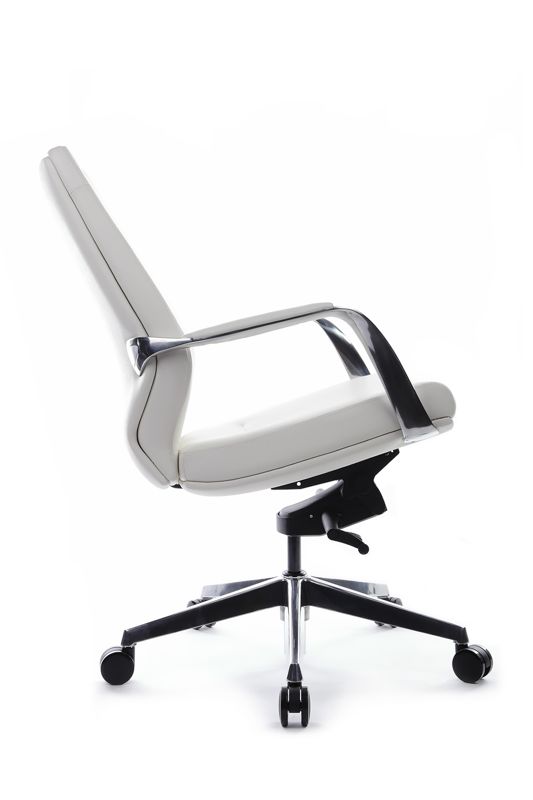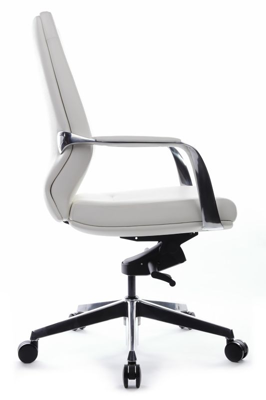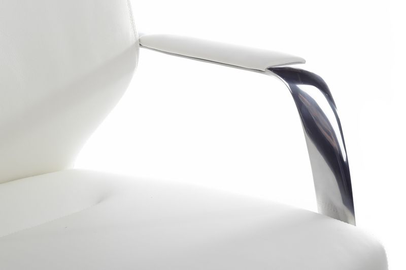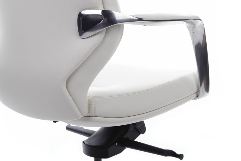 Визуальная лёгкость. Белый цвет обивки из натуральной кожи или экокожи создаёт ощущение простора и свежести. Алюминиевые элементы (основание, подлокотники) добавляют современный акцент, не перегружая пространство.