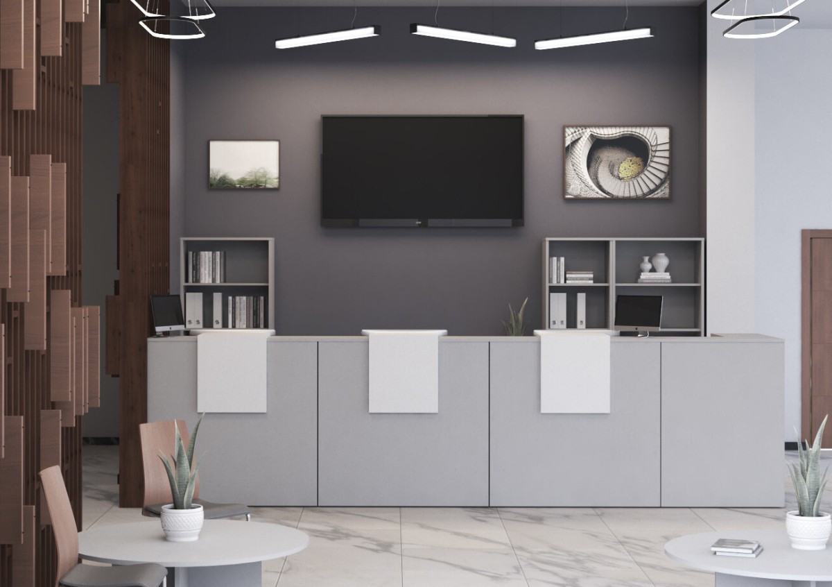 Стойка ресепшн угловая левая Арго А-555 Серый 900х900х1220 (Техно)