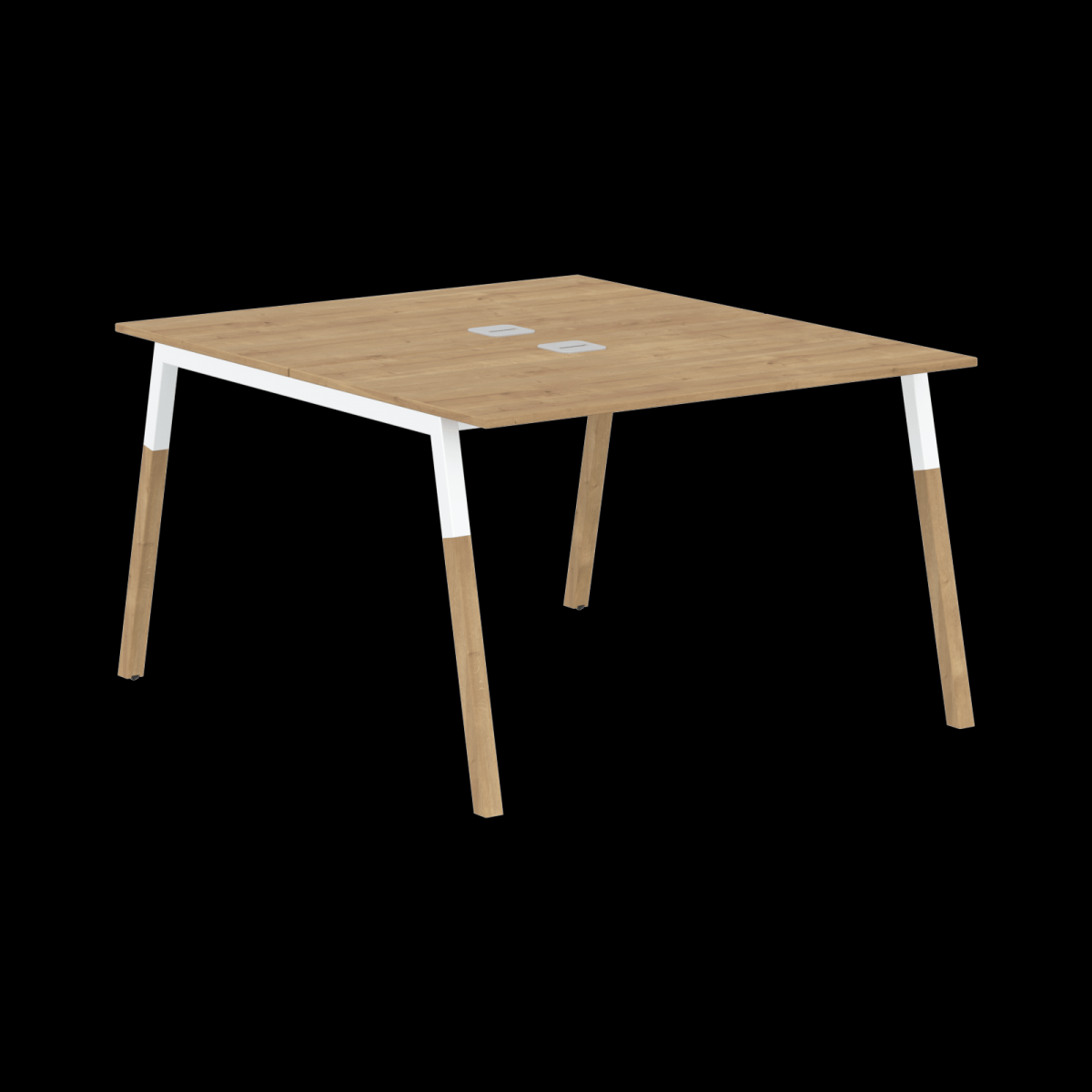 Столешницы из ЛДСП т.18мм. c кромкой ABS т.2.мм, каждая комплектуется квадратной заглушкой кабель-канала по центру и каждая 2-мя траверсами. Между столешницами имеется зазор 6 мм для установки настольных экранов. Опоры комбинированные А-образной формы, верхняя часть из профиля трубы 40х40мм и нижняя часть из массива бука; отделка – масло-воск. Опоры имеют регулировку внизу.