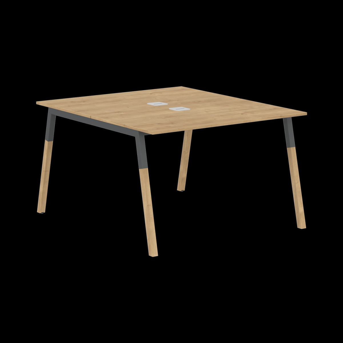 Столешницы из ЛДСП т.18мм. c кромкой ABS т.2.мм, каждая комплектуется квадратной заглушкой кабель-канала по центру и каждая 2-мя траверсами. Между столешницами имеется зазор 6 мм для установки настольных экранов. Опоры комбинированные А-образной формы, верхняя часть из профиля трубы 40х40мм и нижняя часть из массива бука; отделка – масло-воск. Опоры имеют регулировку внизу.