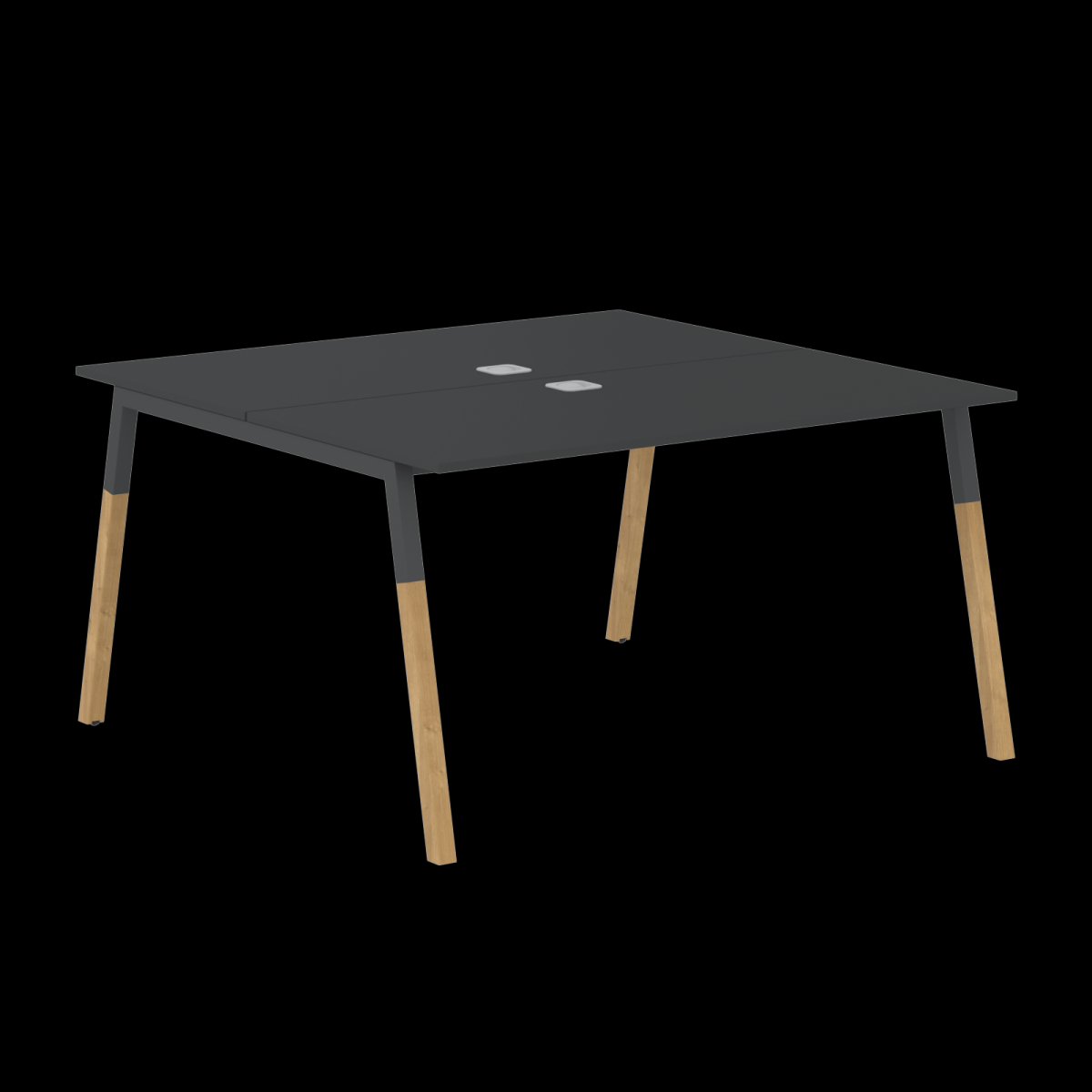 Столешницы из ЛДСП т.18мм. c кромкой ABS т.2.мм, каждая комплектуется квадратной заглушкой кабель-канала по центру и каждая 2-мя траверсами. Между столешницами имеется зазор 6 мм для установки настольных экранов. Опоры комбинированные А-образной формы, верхняя часть из профиля трубы 40х40мм и нижняя часть из массива бука; отделка – масло-воск. Опоры имеют регулировку внизу.