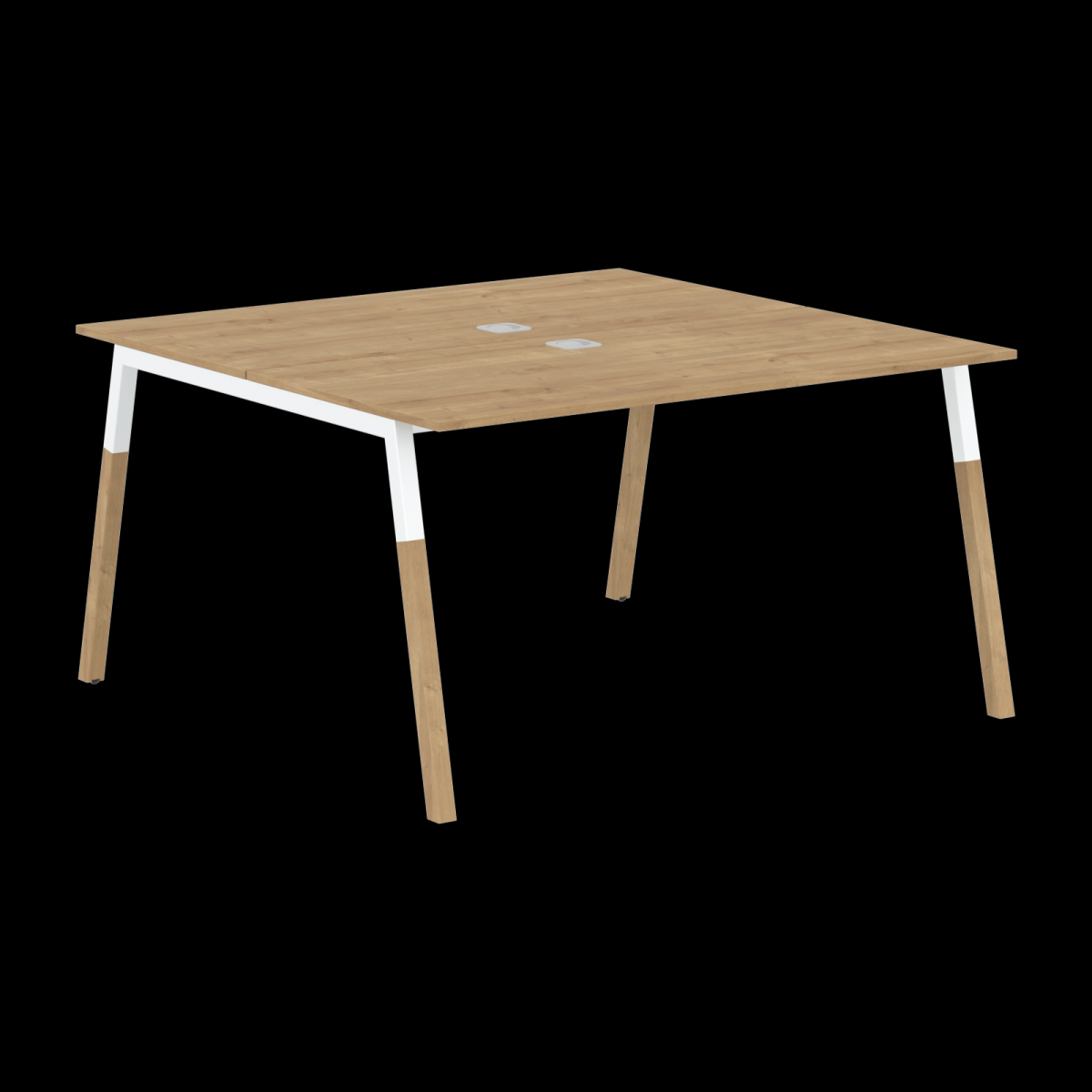 Столешницы из ЛДСП т.18мм. c кромкой ABS т.2.мм, каждая комплектуется квадратной заглушкой кабель-канала по центру и каждая 2-мя траверсами. Между столешницами имеется зазор 6 мм для установки настольных экранов. Опоры комбинированные А-образной формы, верхняя часть из профиля трубы 40х40мм и нижняя часть из массива бука; отделка – масло-воск. Опоры имеют регулировку внизу.