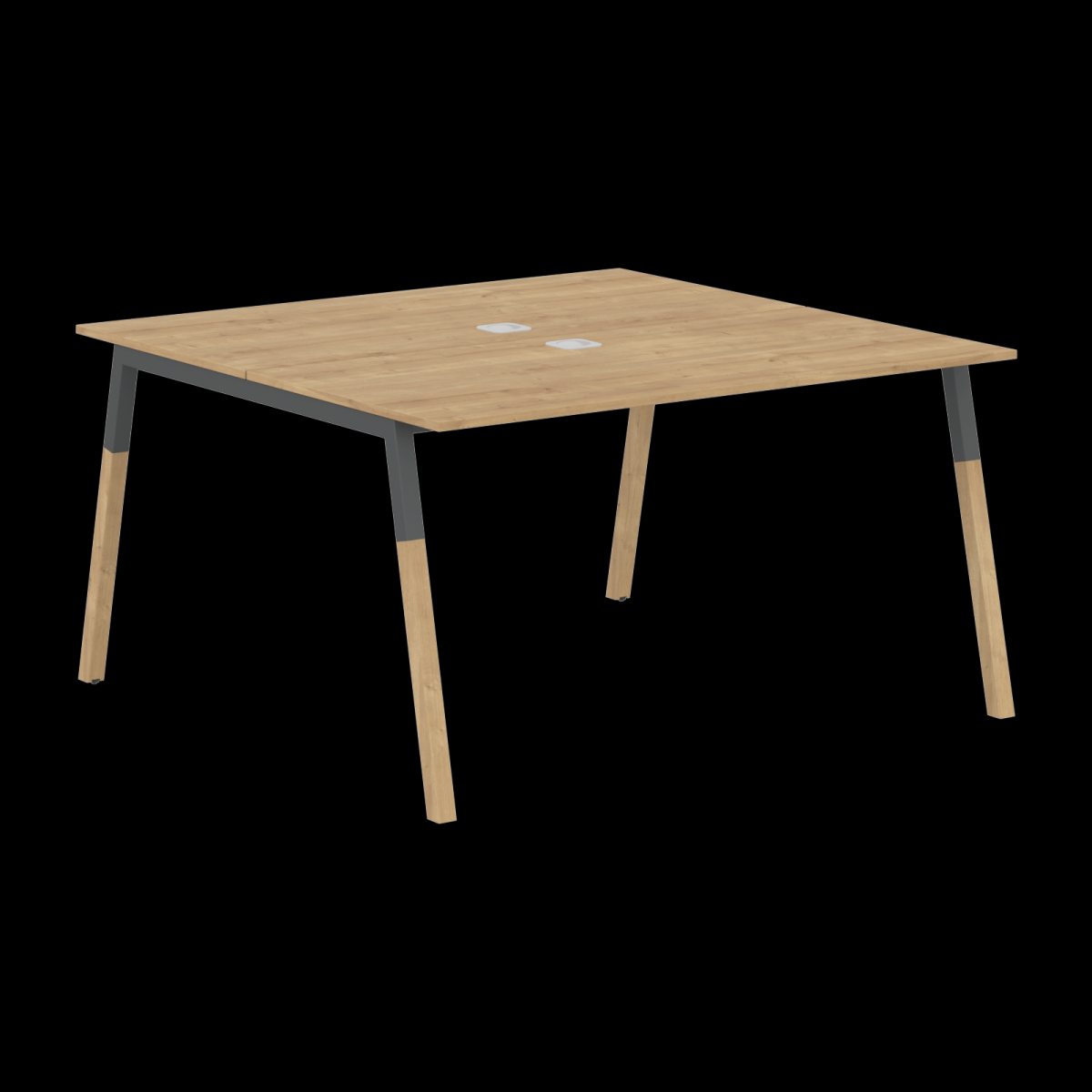 Столешницы ЛДСП т.18мм. c кромкой ABS т.2.мм, каждая комплектуется квадратной заглушкой кабель-канала по центру и каждая 2-мя траверсами. Между столешницами зазор 6мм для установки настольных Экранов. Столешницы комплектуюца Промежуточной опорой комбинированной А-образной формы, верхняя часть из профиля трубы 40х40мм и нижняя часть из массива бука; отделка – масло-воск. Промежуточная опора с регулировкой внизу.