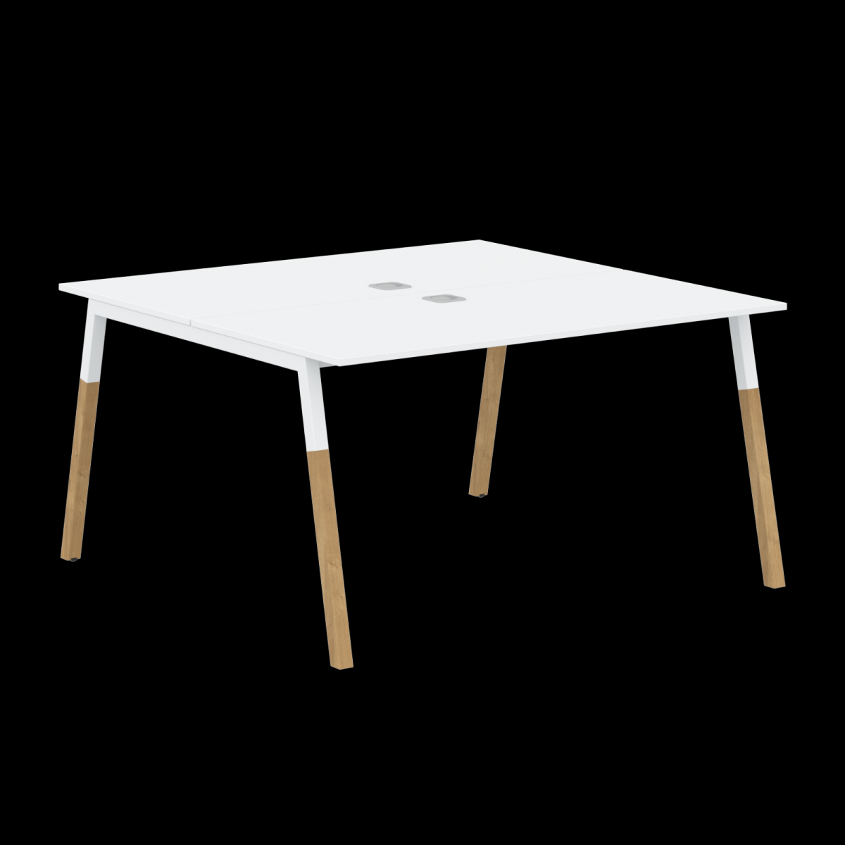 Столешницы ЛДСП т.18мм. c кромкой ABS т.2.мм, каждая комплектуется квадратной заглушкой кабель-канала по центру и каждая 2-мя траверсами. Между столешницами зазор 6мм для установки настольных Экранов. Столешницы комплектуюца Промежуточной опорой комбинированной А-образной формы, верхняя часть из профиля трубы 40х40мм и нижняя часть из массива бука; отделка – масло-воск. Промежуточная опора с регулировкой внизу.