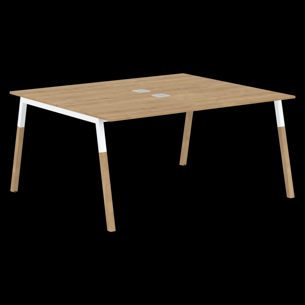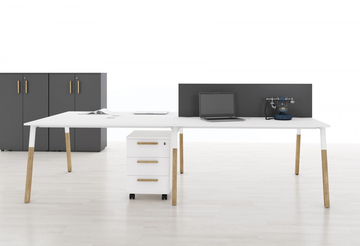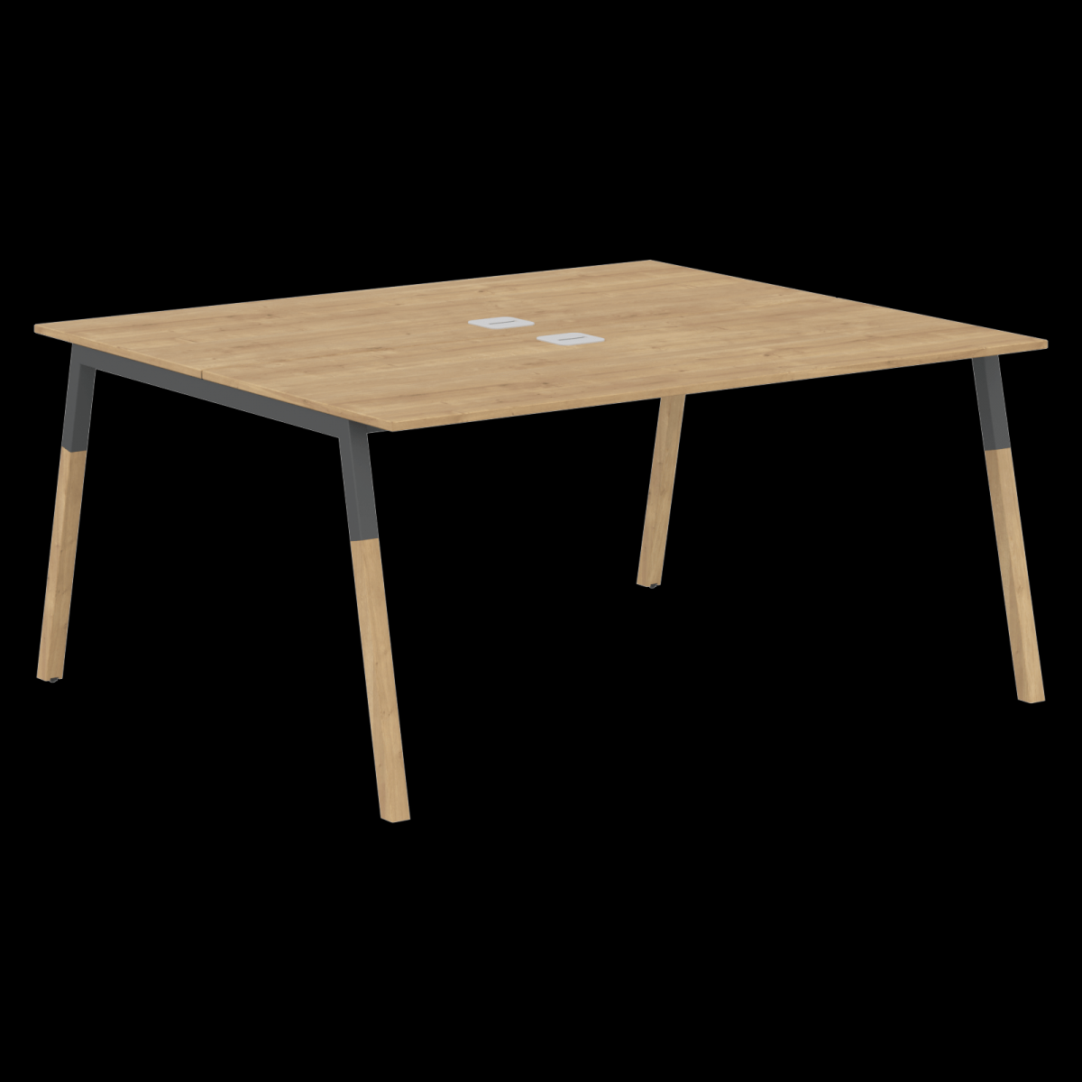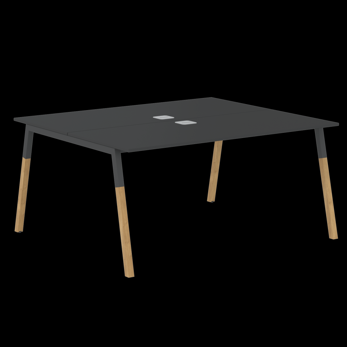 Столешницы ЛДСП т.18мм. c кромкой ABS т.2.мм, каждая комплектуется квадратной заглушкой кабель-канала по центру и каждая 2-мя траверсами. Между столешницами зазор 6мм для установки настольных Экранов. Столешницы комплектуюца Промежуточной опорой комбинированной А-образной формы, верхняя часть из профиля трубы 40х40мм и нижняя часть из массива бука; отделка – масло-воск. Промежуточная опора с регулировкой внизу.
