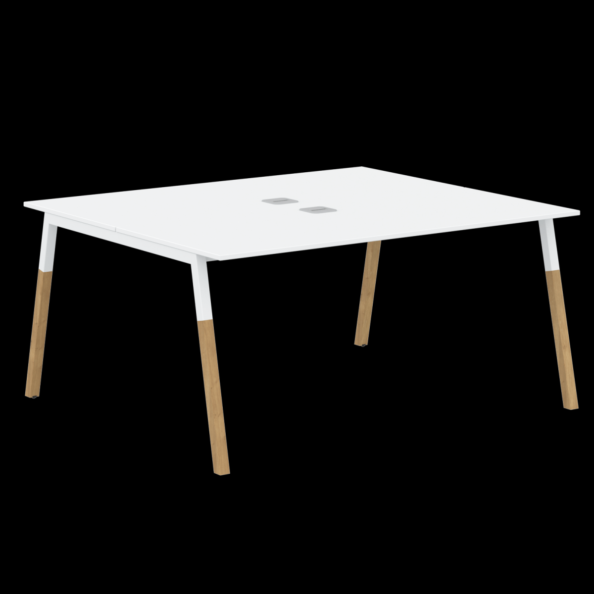 Столешницы ЛДСП т.18мм. c кромкой ABS т.2.мм, каждая комплектуется квадратной заглушкой кабель-канала по центру и каждая 2-мя траверсами. Между столешницами зазор 6мм для установки настольных Экранов. Столешницы комплектуюца Промежуточной опорой комбинированной А-образной формы, верхняя часть из профиля трубы 40х40мм и нижняя часть из массива бука; отделка – масло-воск. Промежуточная опора с регулировкой внизу.