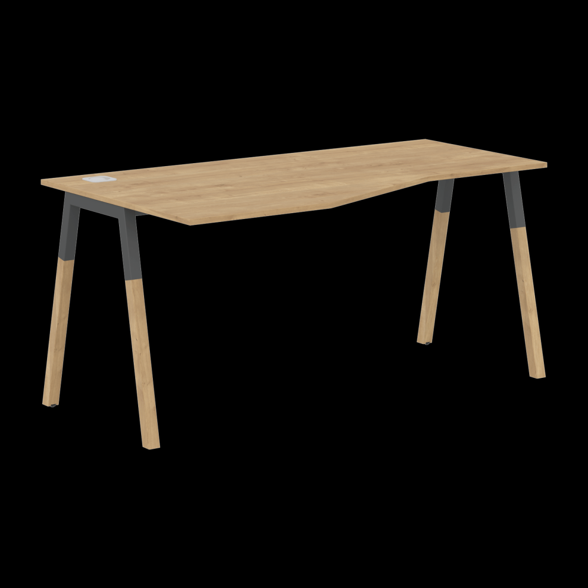 Столешница эргономичная из ЛДСП т.18мм. c кромкой ABS т.2.мм, комплектуется квадратной заглушкой кабель-канала по центру, 2-мя траверсами и комбинированными опорами А-образной формы, верхняя часть из профиля трубы 40х40мм и нижняя часть из массива бука; отделка – масло-воск. Опоры имеют регулировку внизу.