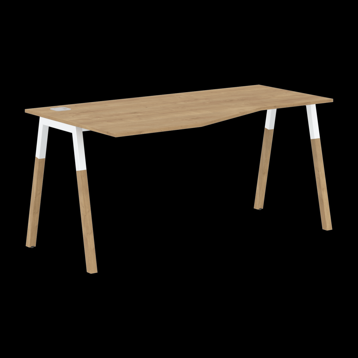 Столешница эргономичная из ЛДСП т.18мм. c кромкой ABS т.2.мм, комплектуется квадратной заглушкой кабель-канала по центру, 2-мя траверсами и комбинированными опорами А-образной формы, верхняя часть из профиля трубы 40х40мм и нижняя часть из массива бука; отделка – масло-воск. Опоры имеют регулировку внизу.