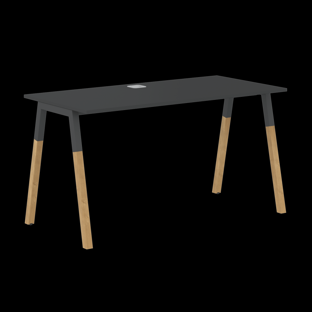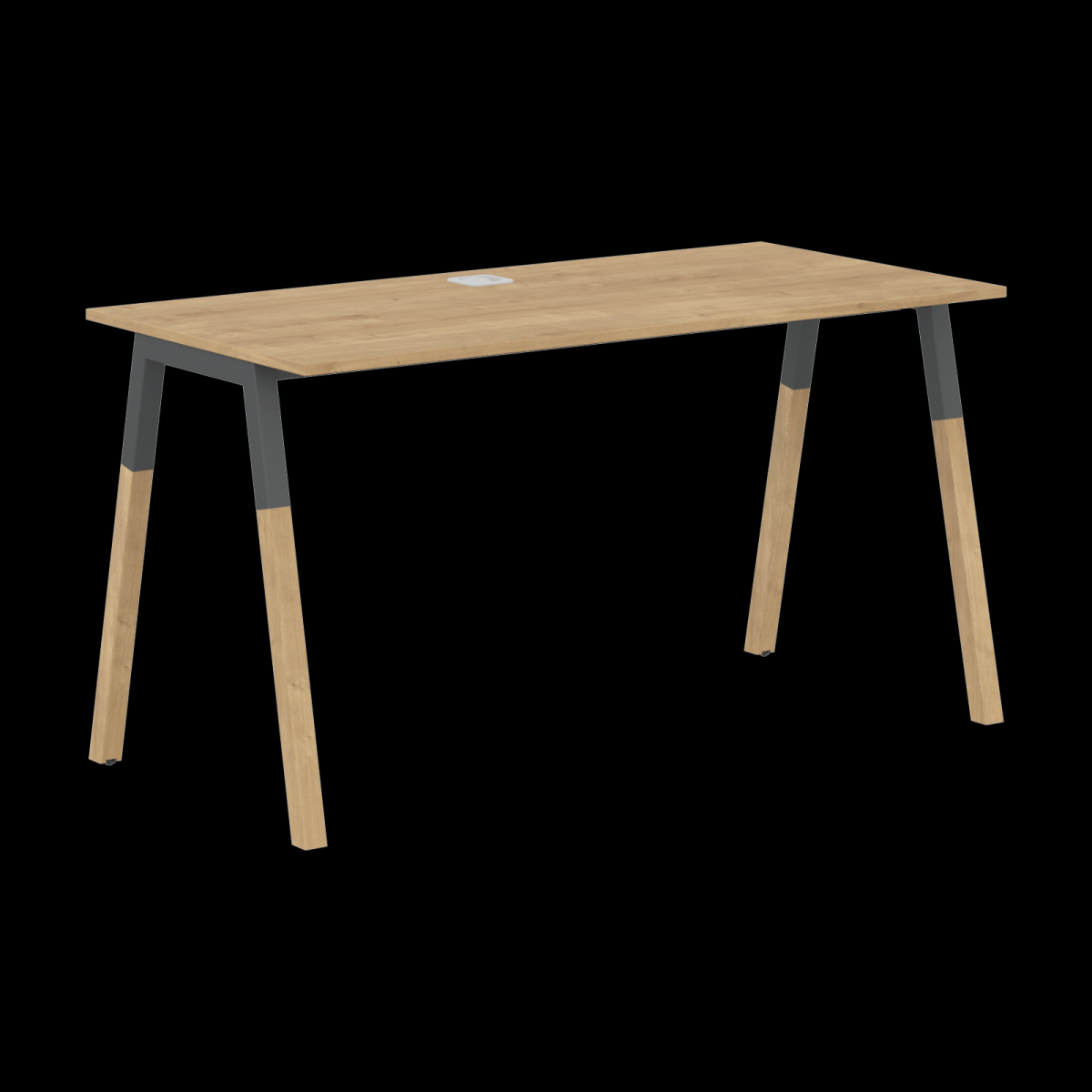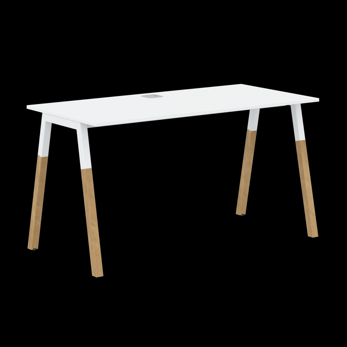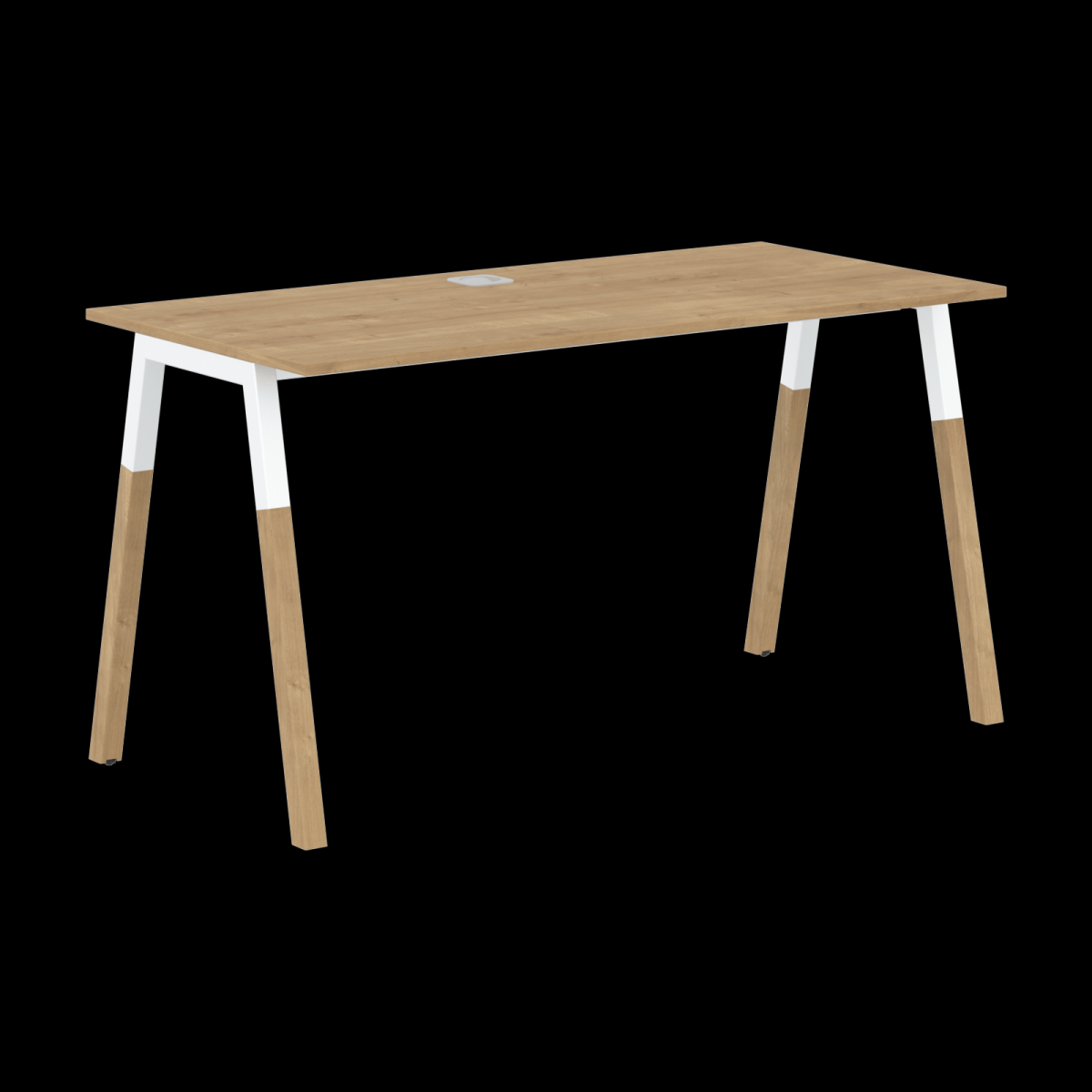 Столешница прямолинейная из ЛДСП т.18мм. c кромкой ABS т.2.мм, комплектуется квадратной заглушкой кабель-канала по центру, 2-мя траверсами и комбинированными опорами А-образной формы, верхняя часть из профиля трубы 40х40мм и нижняя часть из массива бука; отделка – масло-воск. Опоры имеют регулировку внизу.
