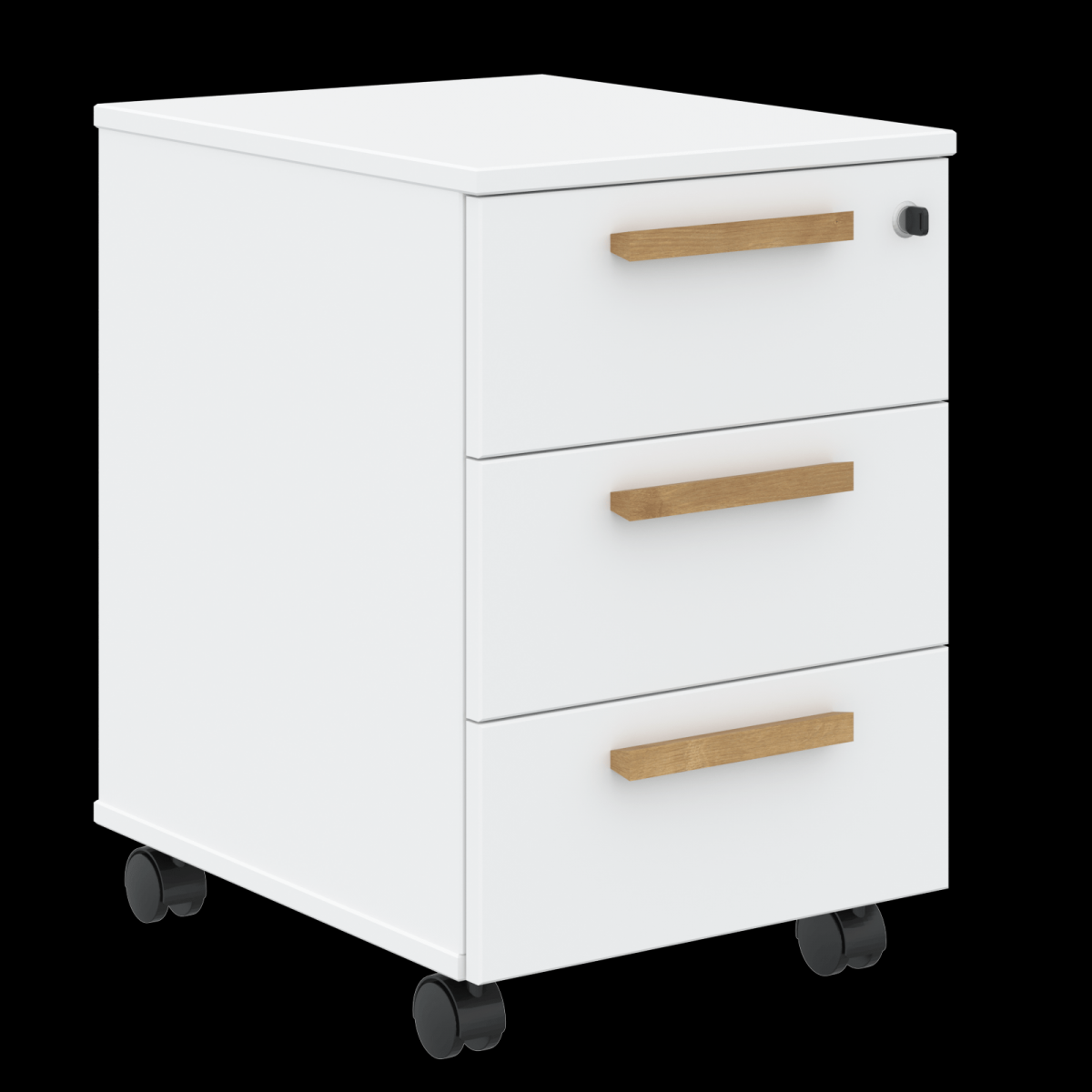 Тумба полностью из ЛДСП т.18мм, кромки ABS т.2 и 0,45мм, комплектуется центральным замком, колесными опорами - 2 со стопором и 2 б/стопора. Ящик - фолдинг и дно белого цвета. Ручка накладная, расположение горизонтальное, материал - массив бука, отделка – масло-воск. Тумба полностью в цвете Белый премиум, Черный графит.