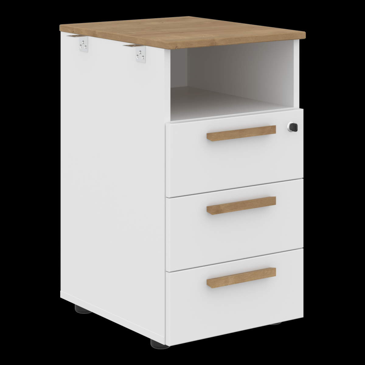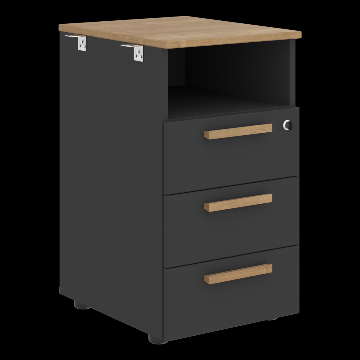 Тумба приставная с открытой нишей и ящиками из ЛДСП т.18мм, с кромками ABS т.2 и 0,45мм, комплектуется центральным замком, регулируемыми опорами шкафной группы 50х27 черного цвета. Ящики-фолдинг и дно белого цвета. Ручки накладные, расположение горизонтальное, материал - массив бука, отделка – масло-воск. Каркас тумбы в цвете Белый премиум и Черный графит, топ в цвете Белый премиум, Черный графит и Дуб Гамильтон.