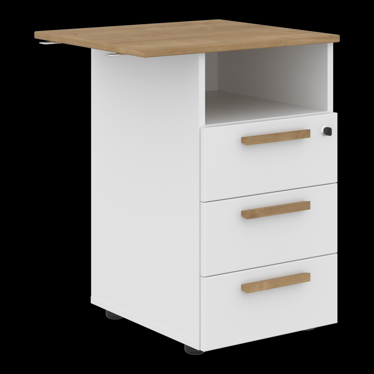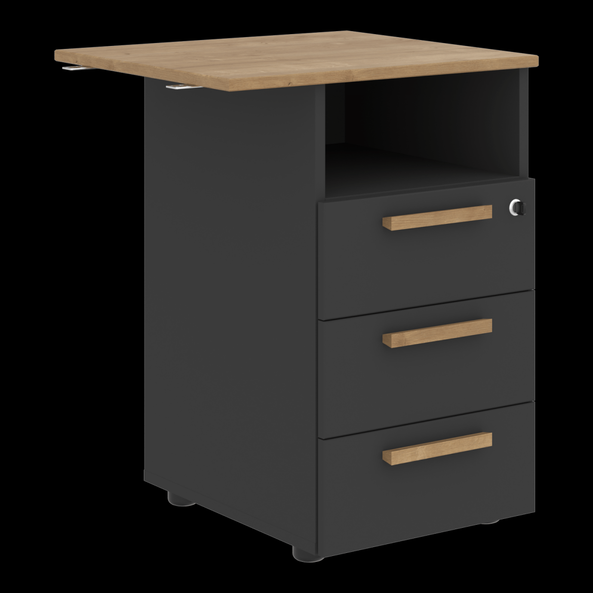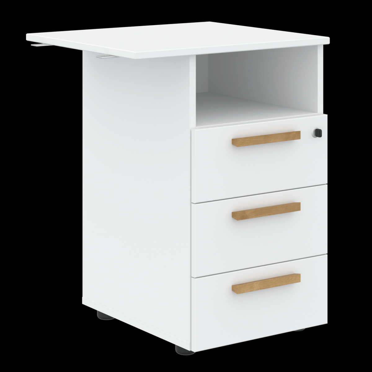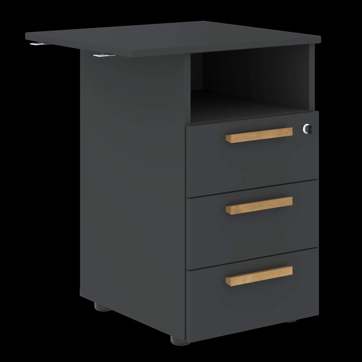 Тумба приставная с открытой нишей, полностью - из ЛДСП т.18мм, с кромками ABS т.2мм и 0,45мм, комплектуется центральным замком, регулируемыми опорами шкафной группы 50х27 черного цвета. Ящики-фолдинг, дно белого цвета. Ручка накладная, расположение горизонтальное, материал - массив бука, отделка – масло-воск. Каркас в цвете Белый премиум и Черный графит, топ в цвете Белый премиум, Черный графит и Дуб Гамильтон.