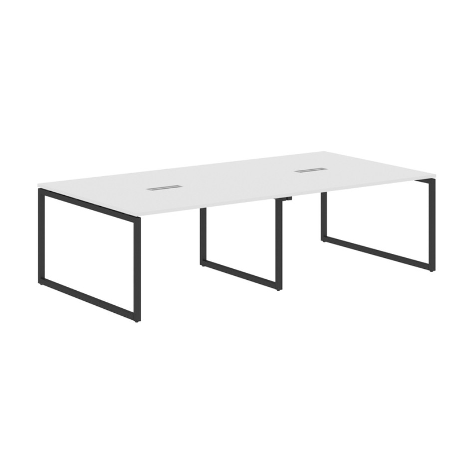 Столешница из ЛДСП т.25мм с металлическими прямоугольными заглушками (кабель-каналами) в центре каждой столешницы. Металлокаркас замкнутый О-образной формы из трубы 40х40х2 с регулировкой внизу.