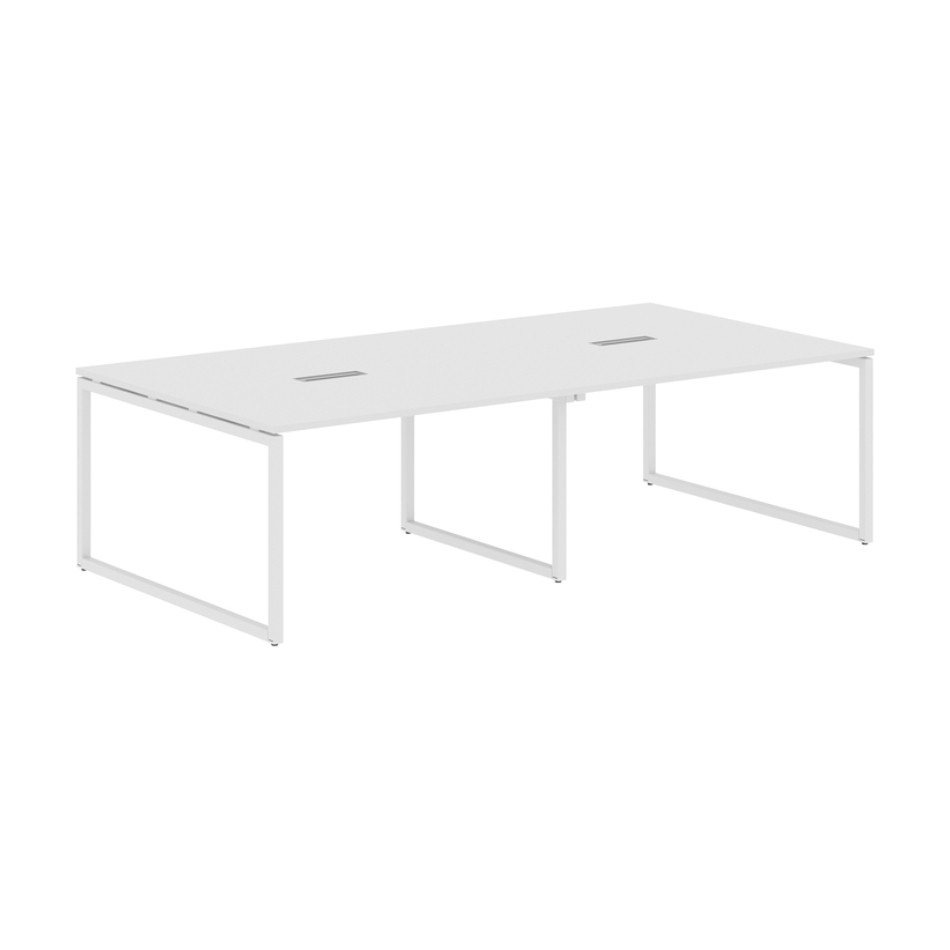 Столешница из ЛДСП т.25мм с металлическими прямоугольными заглушками (кабель-каналами) в центре каждой столешницы. Металлокаркас замкнутый О-образной формы из трубы 40х40х2 с регулировкой внизу.