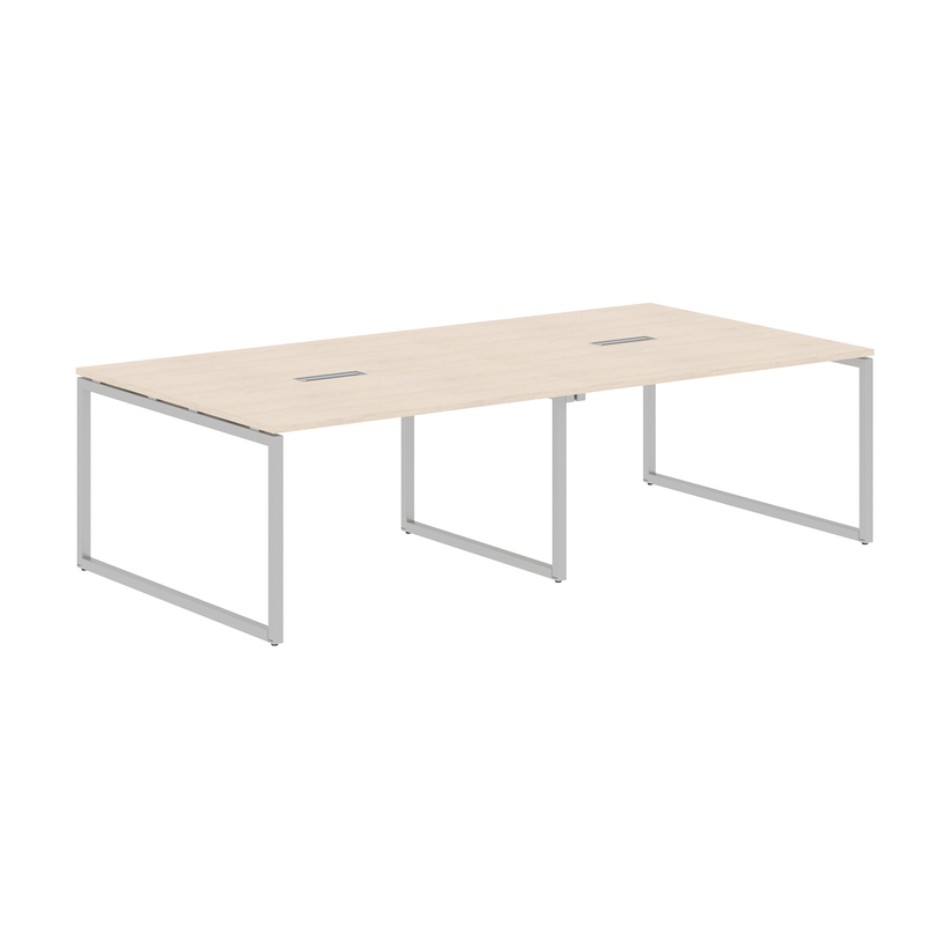 Столешница из ЛДСП т.25мм с металлическими прямоугольными заглушками (кабель-каналами) в центре каждой столешницы. Металлокаркас замкнутый О-образной формы из трубы 40х40х2 с регулировкой внизу.