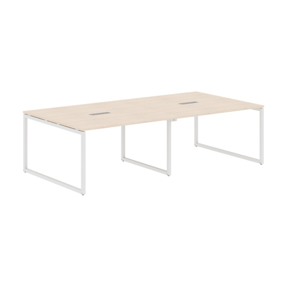 Столешница из ЛДСП т.25мм с металлическими прямоугольными заглушками (кабель-каналами) в центре каждой столешницы. Металлокаркас замкнутый О-образной формы из трубы 40х40х2 с регулировкой внизу.