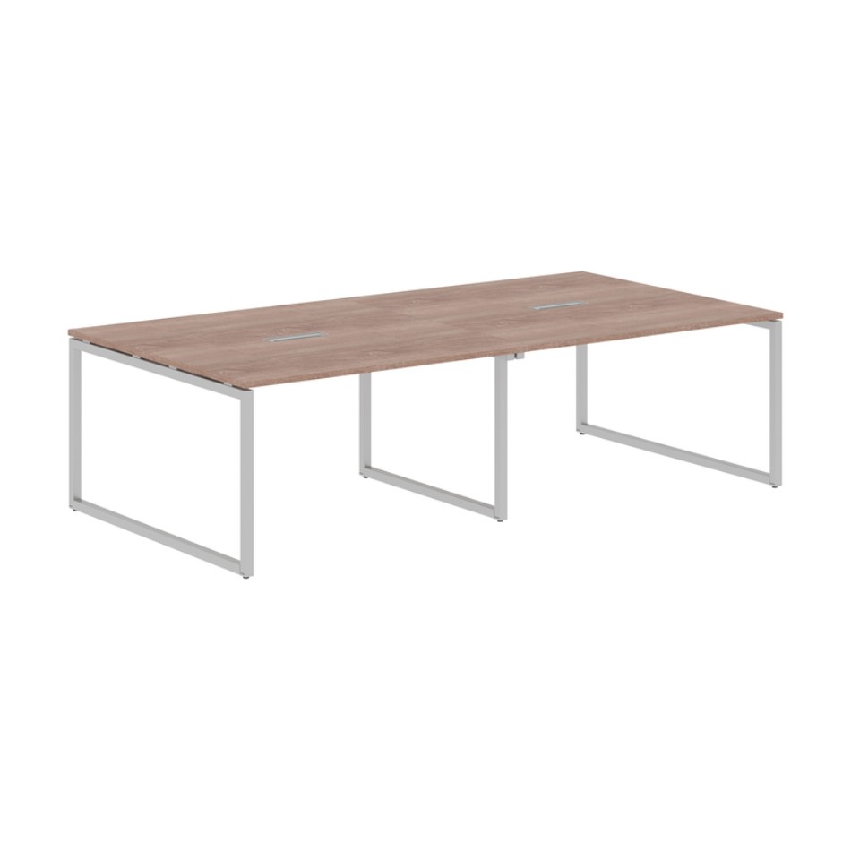 Столешница из ЛДСП т.25мм с металлическими прямоугольными заглушками (кабель-каналами) в центре каждой столешницы. Металлокаркас замкнутый О-образной формы из трубы 40х40х2 с регулировкой внизу.