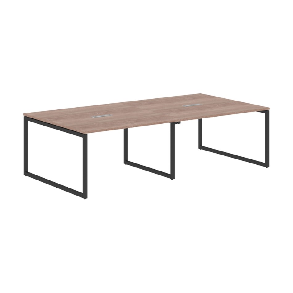 Столешница из ЛДСП т.25мм с металлическими прямоугольными заглушками (кабель-каналами) в центре каждой столешницы. Металлокаркас замкнутый О-образной формы из трубы 40х40х2 с регулировкой внизу.