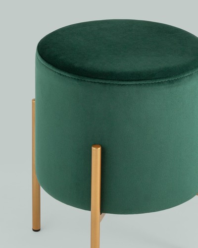 Стильный круглый пуф на металлических ножках. Мягкая обивка выполнена из износостойкого велюра, тактильно приятный и долговечный материал. Металлические ножки золотого цвета высотой 14,5 см выдерживают нагрузку до 80 кг. Подпятники в основании ножек делают пуф более устойчивым и предотвращают скольжение. Отличное дополнение в интерьер спальни, прихожей или зала.