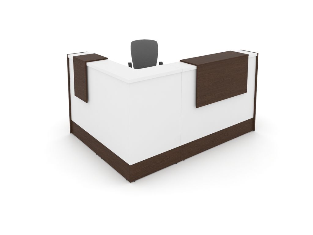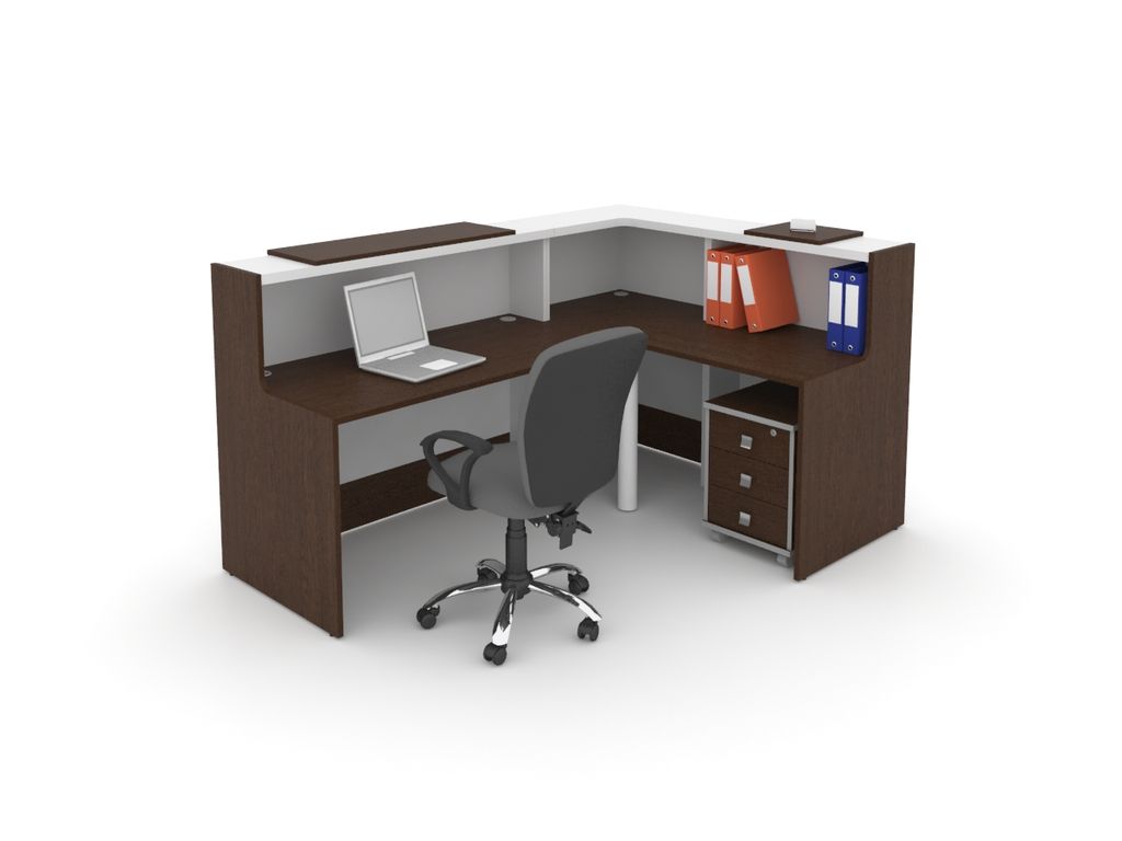 Ресепшн угловой в сборе Рива серии STYLE с подкатной тумбой современного дизайна. Состоит из прямых элементов Л.МП-2+Л.МП-4, углового элемента Л.УМ-1Л/Пр (угол выбирается по желанию и установки ресепшена) и декоротивных накладок Л.Н-2+Л.Н-4. В комплект рабочего пространства входит подкатная тумба с замком на верхнем ящике Л.ТМ-3.