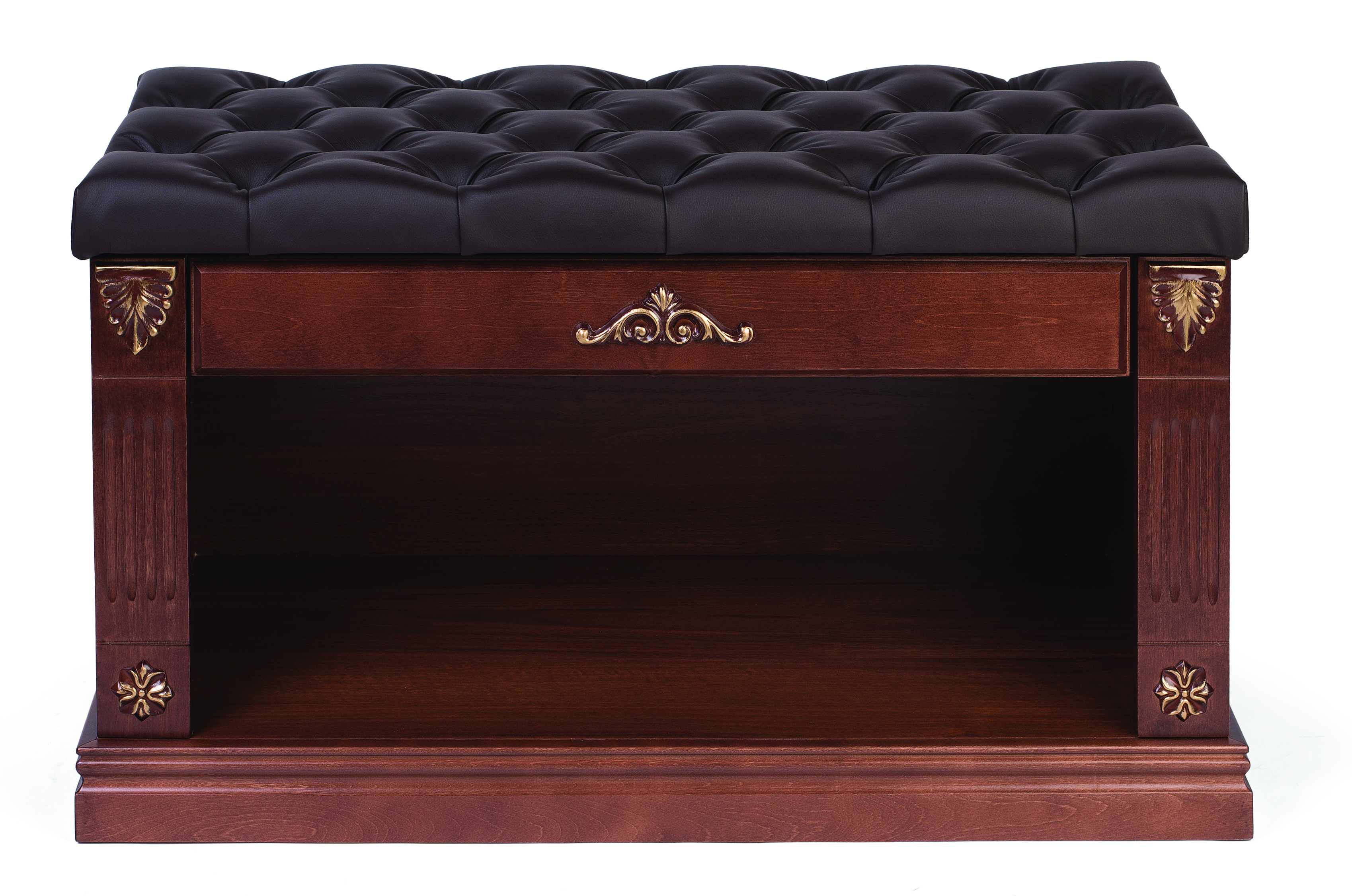 - Массивный цоколь, пилястры по бокам с объемными декоративными элементами и фрезеровками относят эту модель к традиционному классическому стилю. Этому же служит стеганая подушка, декорированная эко-кожей. Под открывающейся подушкой расположен потайной ящик для различных мелочей.