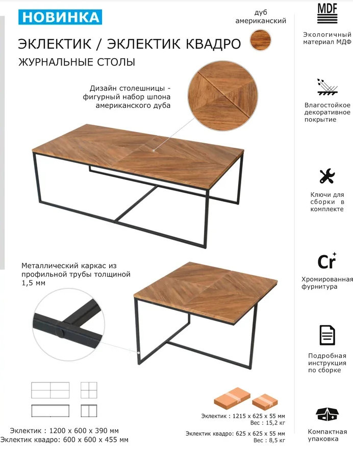 Оригинальность столу "Эклектик квадро" придает дизайн столешницы с необычным направлением текстуры пленки американского дуба. Лаконичность форм и практичность исполнения столика безусловно будет залогом отличного дизайнерского оформления гостиной. Металлический каркас выполнен из профильной трубы 15*15 мм, столешница выполнена из экологичного материала ЛМДФ, облицованного влагостойким декоративным покрытием.